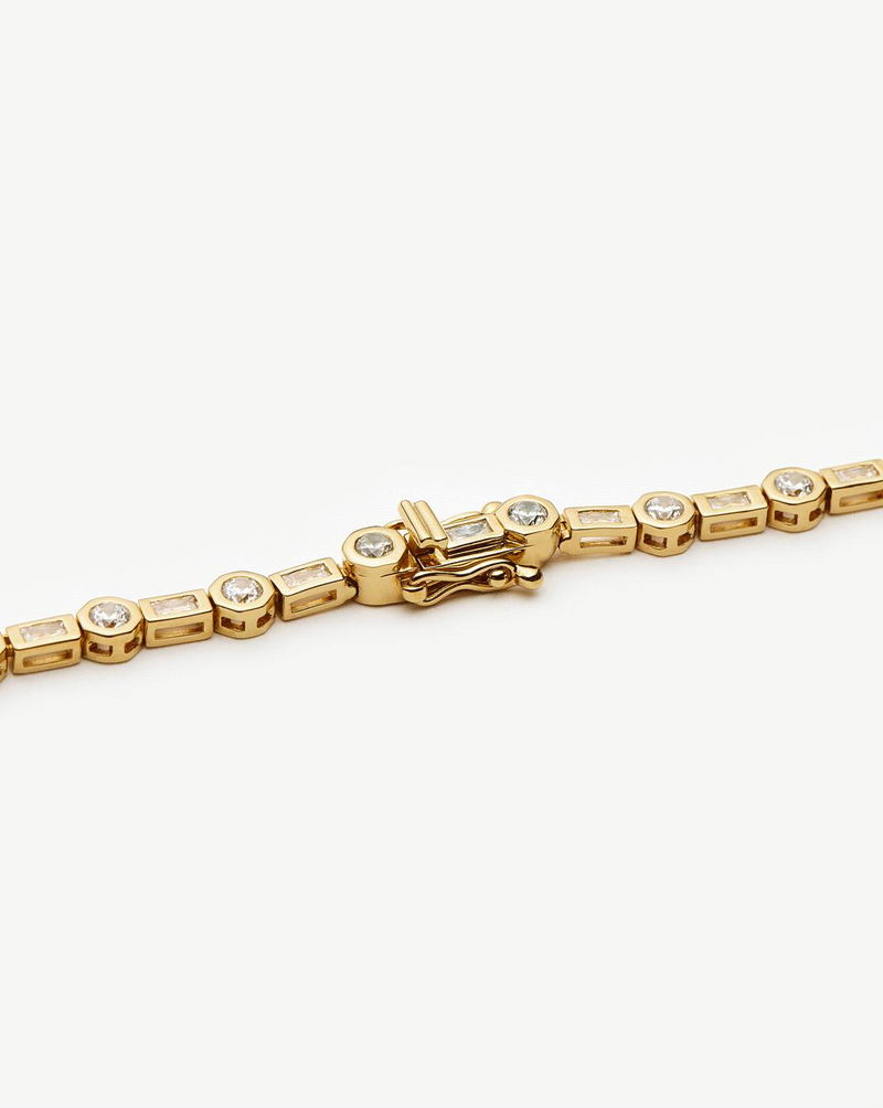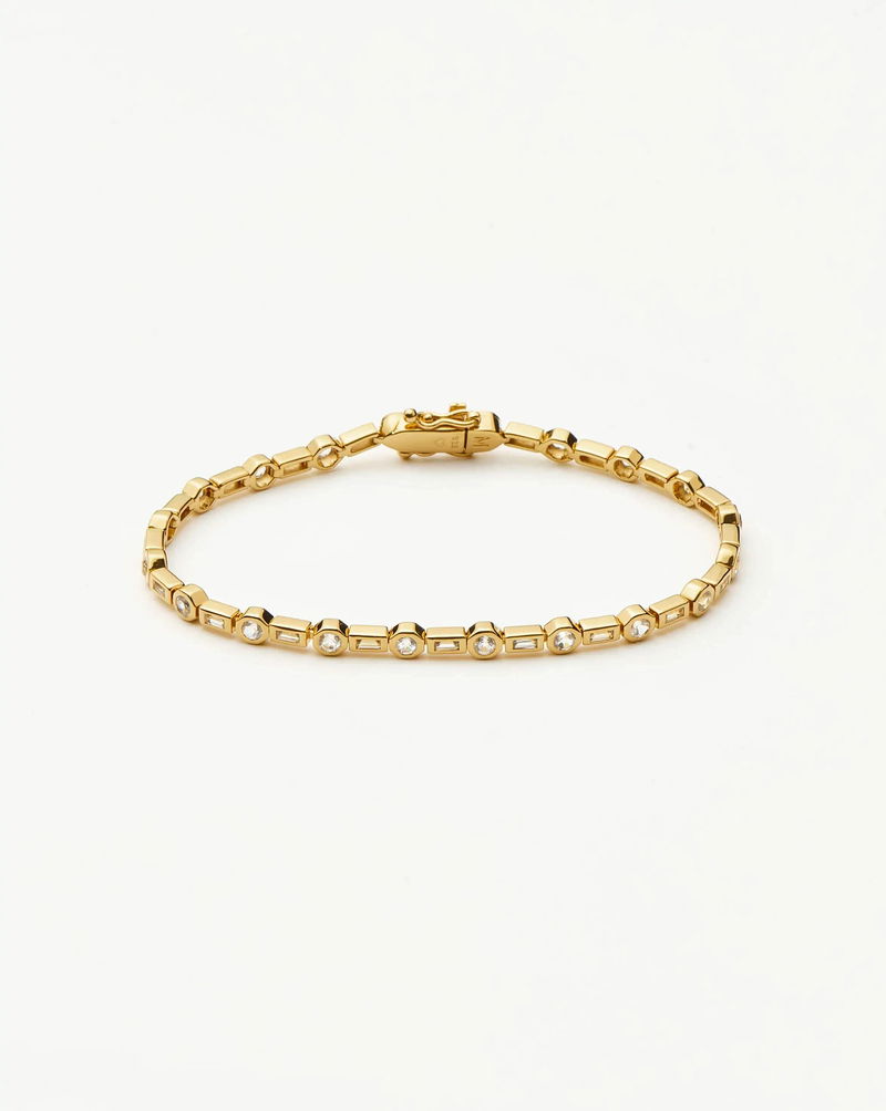 Celebrating ten years of the original jewellery collaboration with style icon Lucy Williams. A Lucy Williams x Missoma take on our best selling tennis bracelets. This elegant chain features alternating baguette cubic zirconia stones set into rectangles and round cubic zirconia stones set into hexagons, finished with our signature tennis clasp. Style with more tennis bracelets for the ultimate arm stack moment. This bracelet is a fixed length and can't be adjusted.