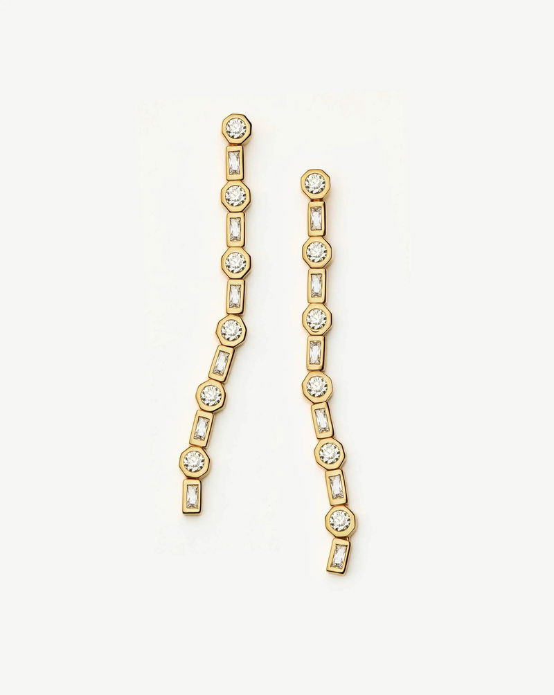 Celebrating ten years of the original jewellery collaboration with style icon Lucy Williams. These timeless tennis large drop earrings feature alternating baguette cubic zirconia stones set into rectangles and round cubic zirconia stones set into hexagons.