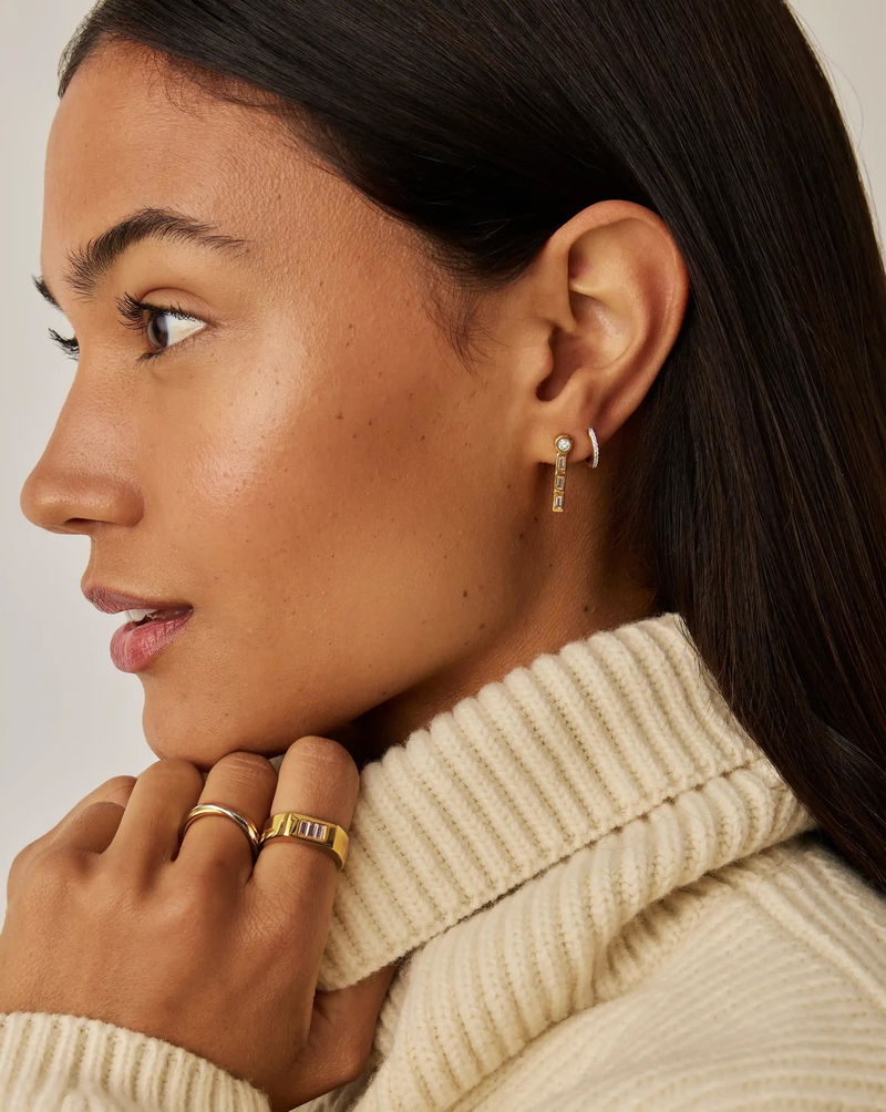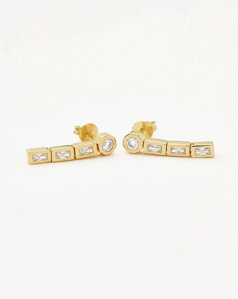 Celebrating ten years of the original jewellery collaboration with style icon Lucy Williams. These timeless small tennis drop earrings feature round cubic zirconia stones set into hexagon studs with an elegant drop of three baguette cubic zirconia stones. Style with small studs for an ear stack moment or match with the new Lucy Williams Tennis Necklace.