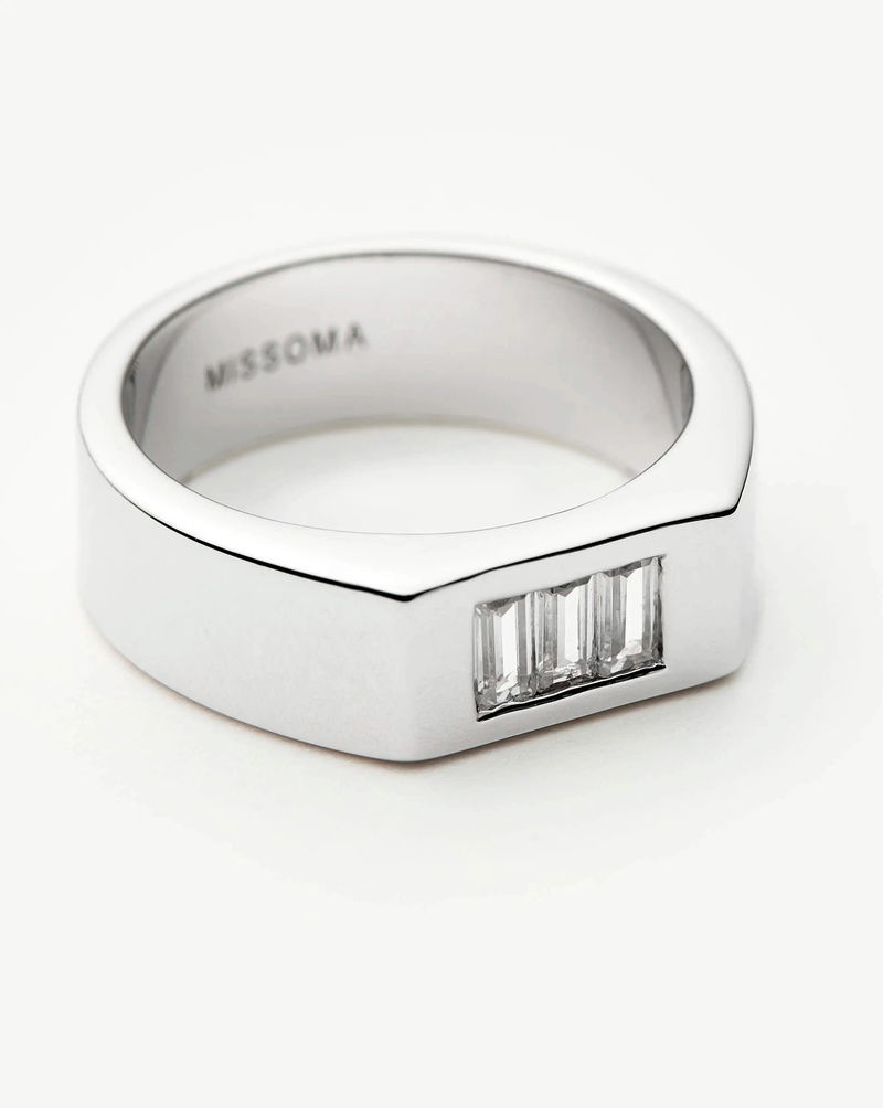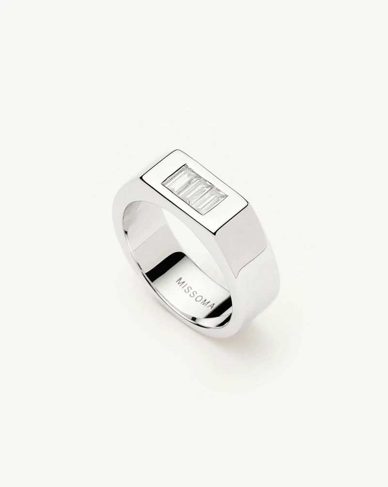 Celebrating ten years of the original jewellery collaboration with style icon Lucy Williams. Your new everyday essential with a bold twist. This statement ring features three classic baguette cubic zirconia stones set into a flat surface of a chunky silver band. Wear solo or style with stacking and mixed metal rings.