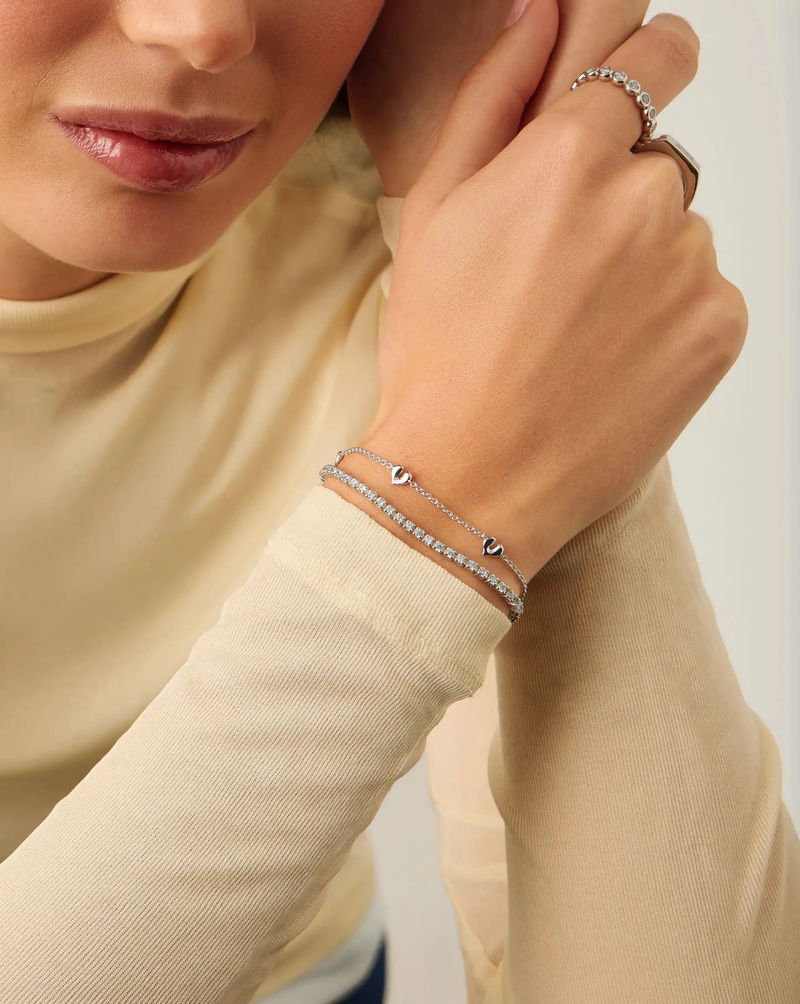 This everyday bracelet makes the perfect stacking piece, featuring five mini heart charms. On a delicate chain, stacking with other bracelets or pair with our Molten Heart Mini Charm Choker. Layer for less when bought as a set Molten Heart Mini Charm Choker & Bracelet Set.
