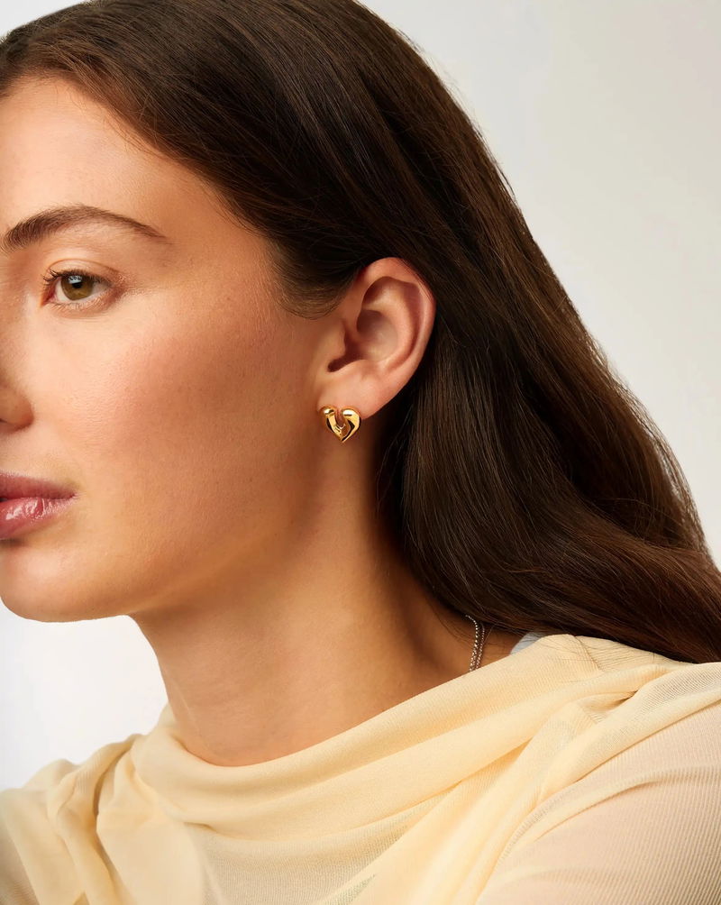 These everyday studs feature a liquid heart motif: designed to feel weighty and comforting, inspired by the ergonomic feel of holding a smooth pebble in your palm. Let them shine solo or stack with other studs and mini hoops.