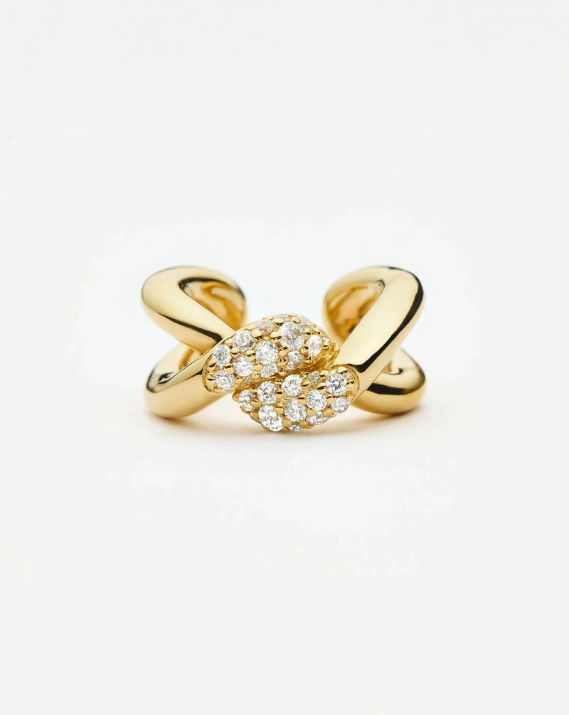 An evolution of our classic Molten design, this statement ear cuff features twisted detailing. The molten gold texture gives the piece a sculptural look with a frosting of snow pavé to mimic ice crystals. Artfully hand-set, this highly-skilled technique is usually only seen in the most delicate of fine jewellery pieces. Elevate your everyday stack or let it shine this party season. Wear with the Molten Twisted Small Hoop Earrings for maximum impact.