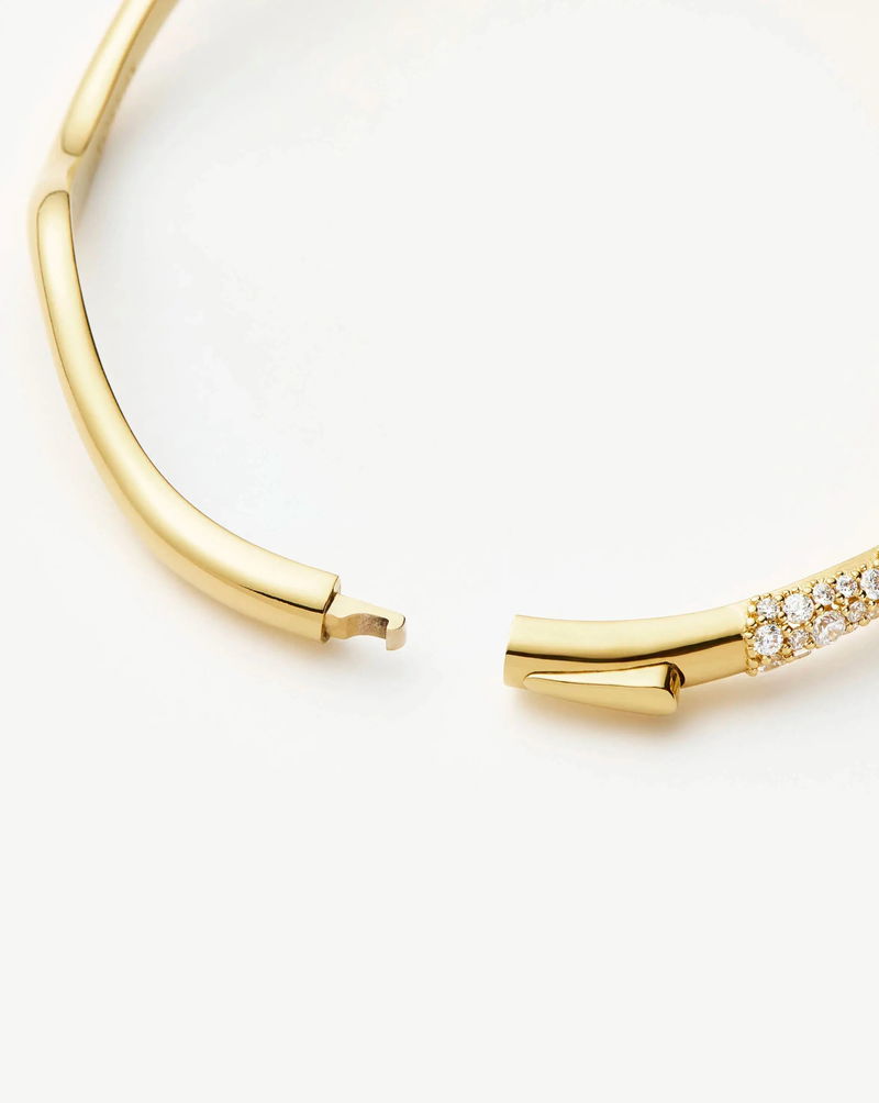 An evolution of our best selling Molten and Magma collections with soft organic curves. The molten gold texture gives the hinged bangle a sculptural look with a frosting of snow pavé to mimic ice crystals. Artfully hand-set, this highly-skilled technique is usually only seen in the most delicate of fine jewellery pieces. Designed with a hinged closure for easy wear, its refined curves and subtle shimmer make it the perfect piece to elevate your everyday bracelet stack.