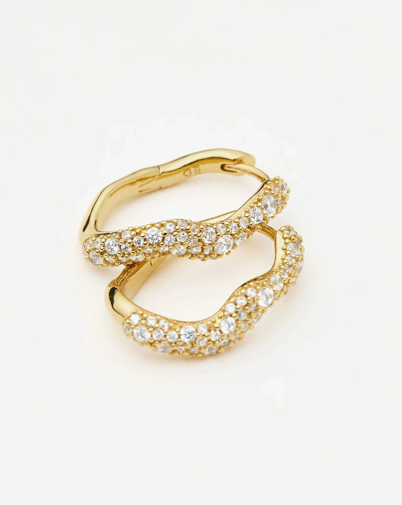 An evolution of the best selling Molten and Magma collections with soft organic curves. The molten gold texture gives these small hoops a sculptural look with a frosting of snow pavé to mimic ice crystals. Artfully hand-set, this highly-skilled technique is usually only seen in the most delicate of fine jewellery pieces. Their refined curves and subtle shimmer make them the perfect day-to-night piece, instantly elevating your everyday ear stack. Wear solo for subtle shimmer or stack with your favourite hoops and studs for maximum impact.