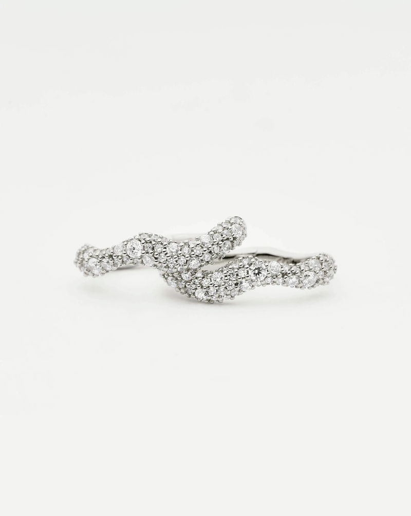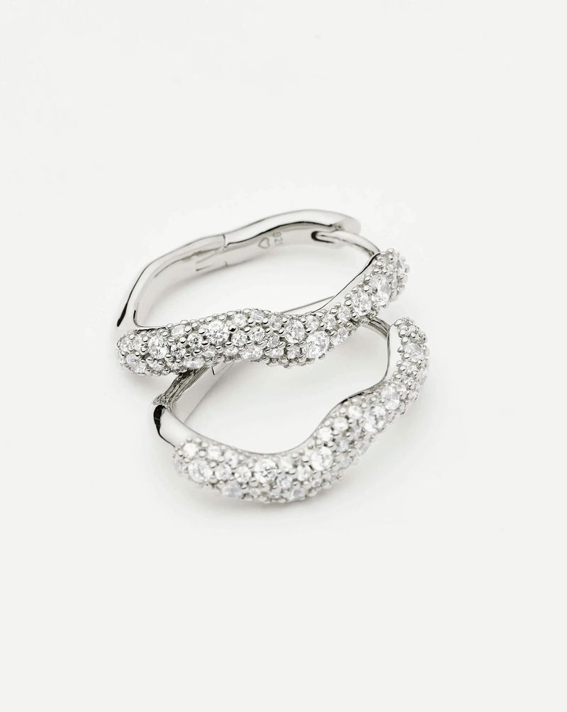 An evolution of the best selling Molten and Magma collections with soft organic curves. The molten silver texture gives these small hoops a sculptural look with a frosting of snow pavé to mimic ice crystals.