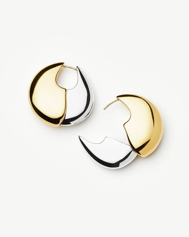 Inspired by sculptural shapes, these mixed metal pebble-shaped medium hoop earrings can be worn with either silver or gold side facing forward, giving you two pairs of hoops in one. Style solo or pair with studs for an instant ear stack.