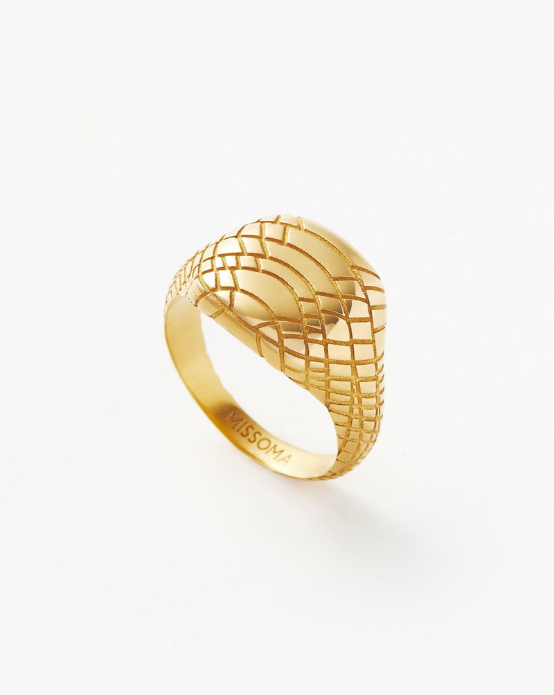 This statement signet ring features an engraved snakeskin texture that adds drama to your ring stack. Finished in a matte medium polish for a vintage feel.