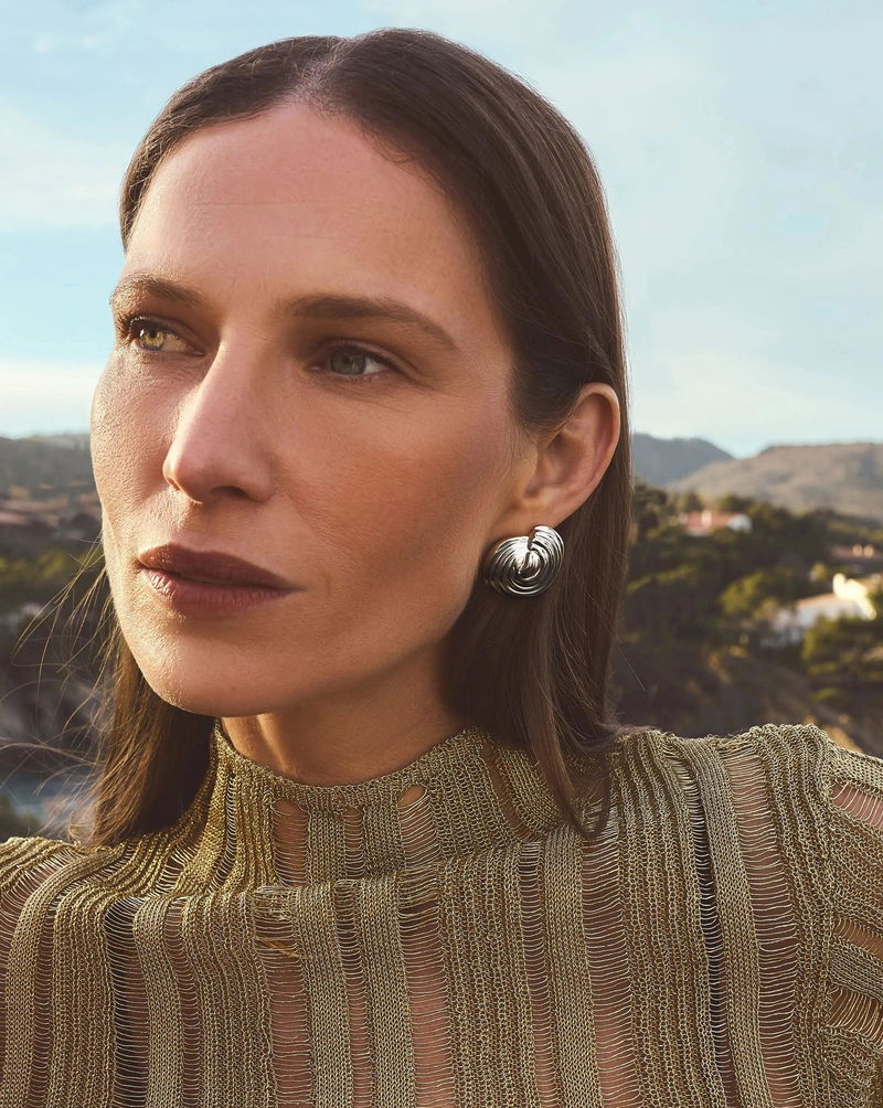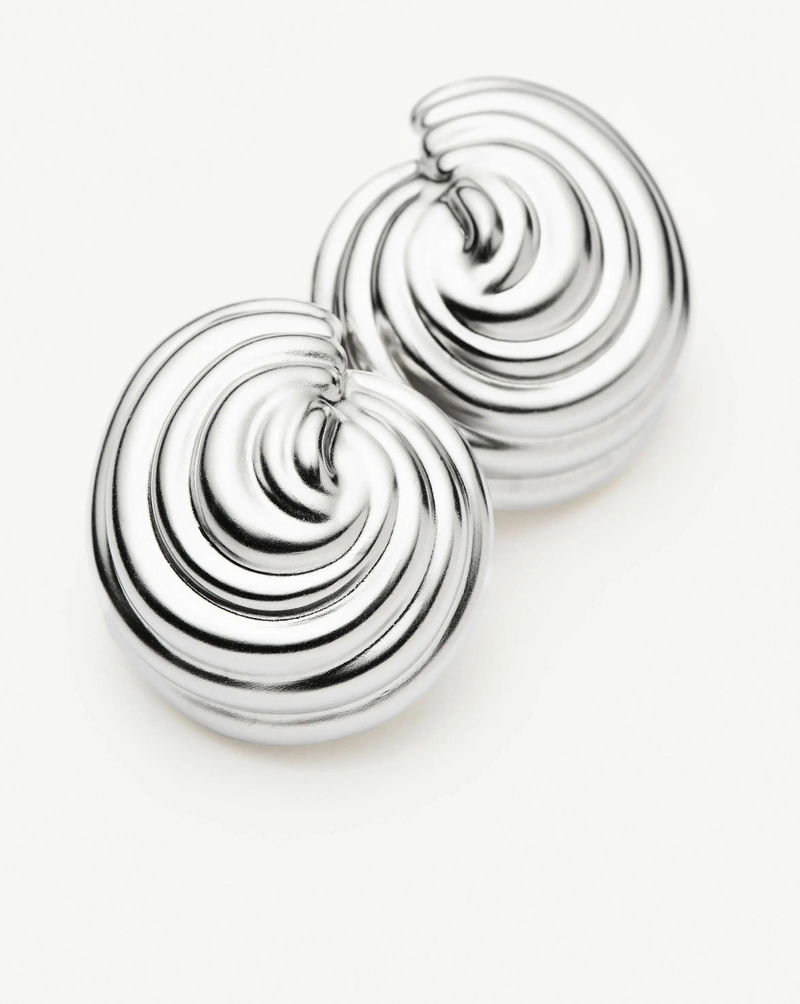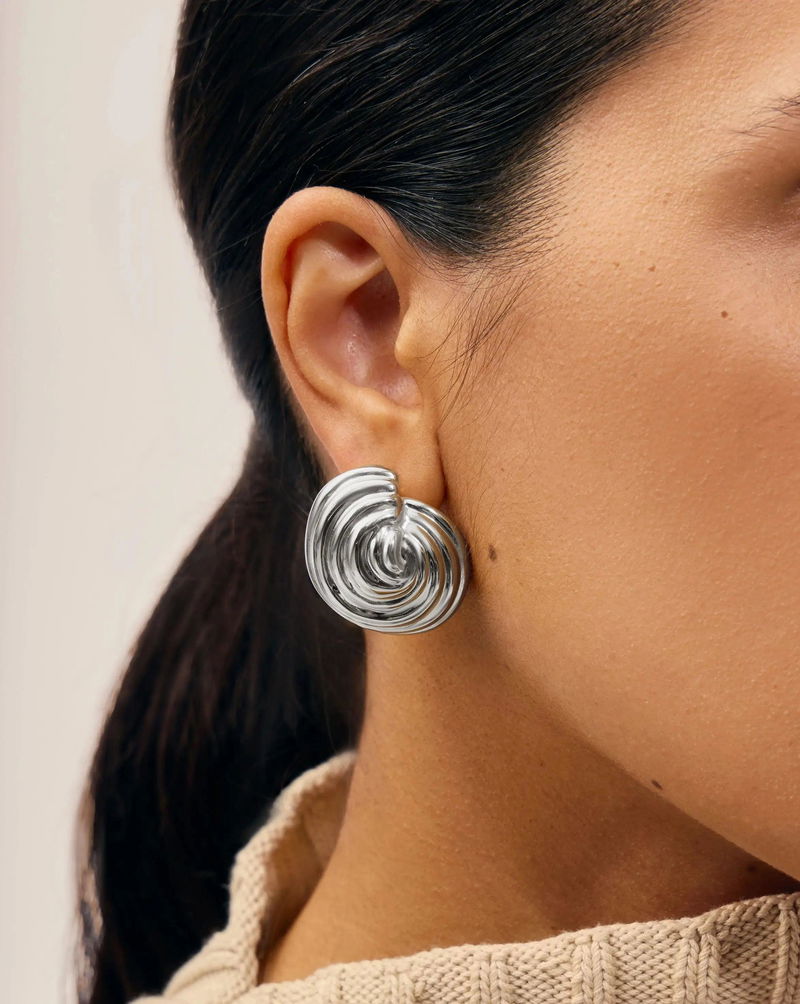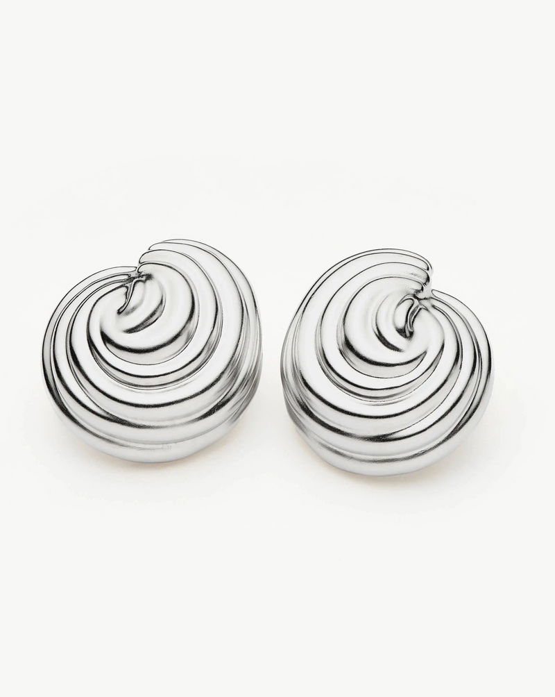 These large statement oceanic-inspired stud earrings feature a three-dimensional domed spiral shape for a voluminous effect. Style with mini hoops & huggies or small stud earrings.