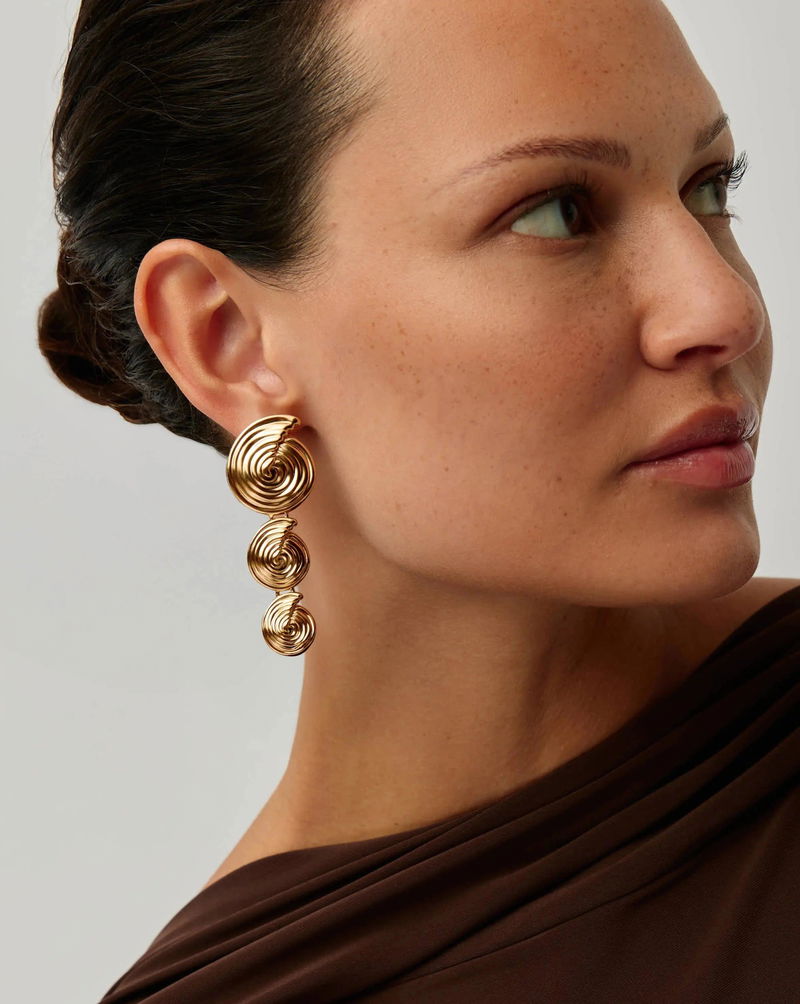 These statement drop earrings feature eye-catching linked spiral elements that gradually decline in scale. Wear solo for a summer occasion or layer up with beaded gemstone or pendant necklaces.