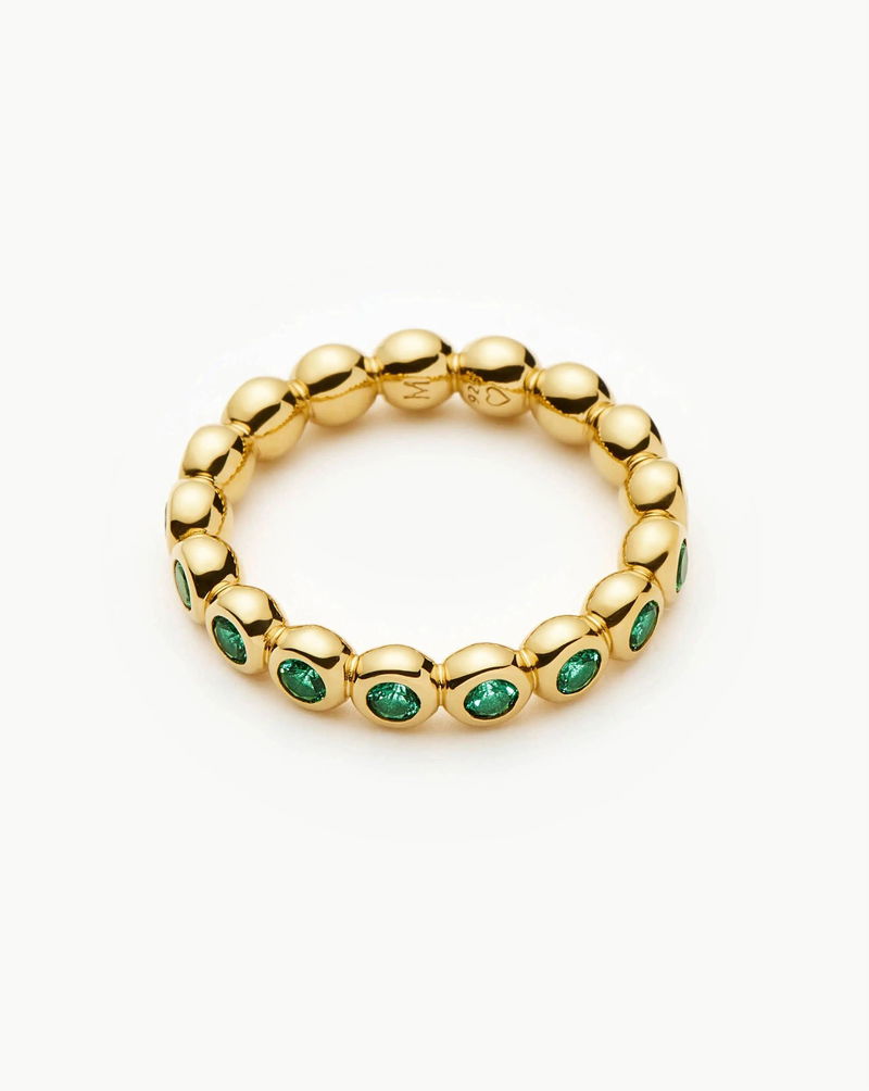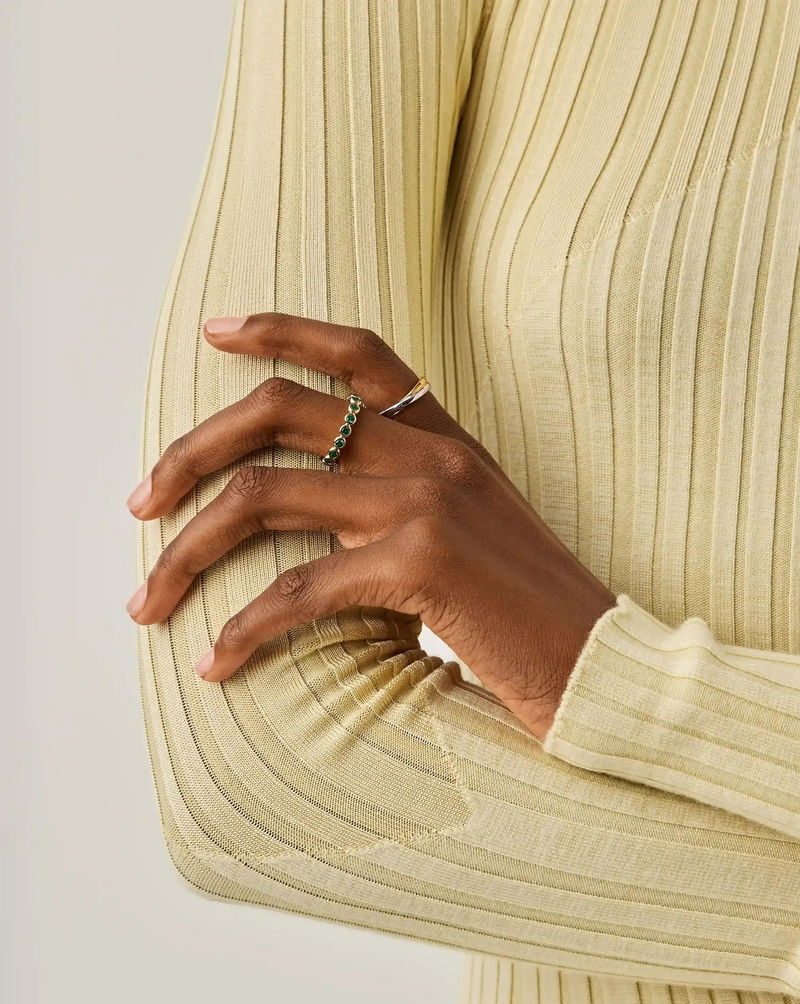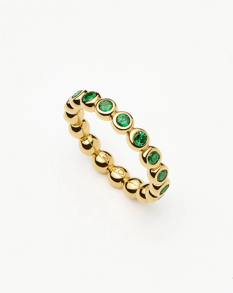 A fresh take on our most loved Tennis Eternity Stacking Ring in a brand-new emerald green colourway. This classic eternity ring features faceted nano-crystals set in gold collet cups.