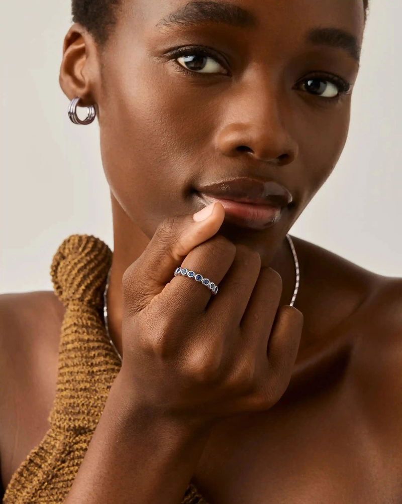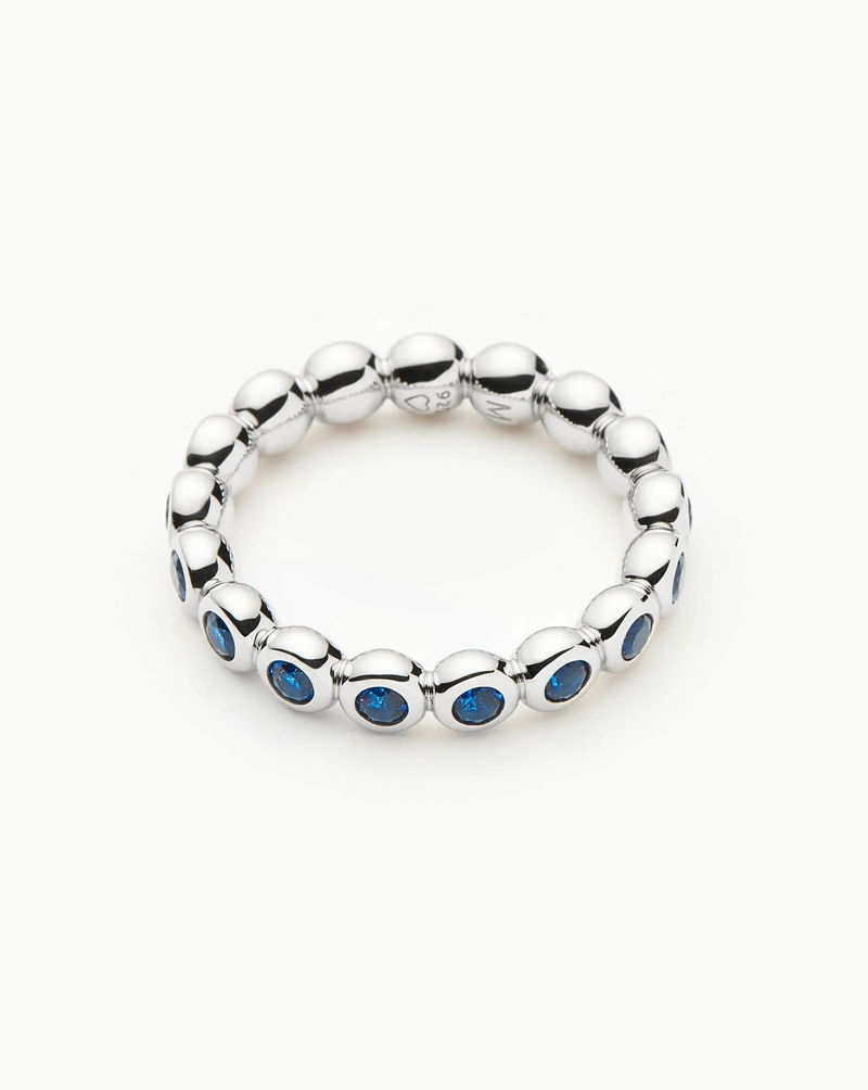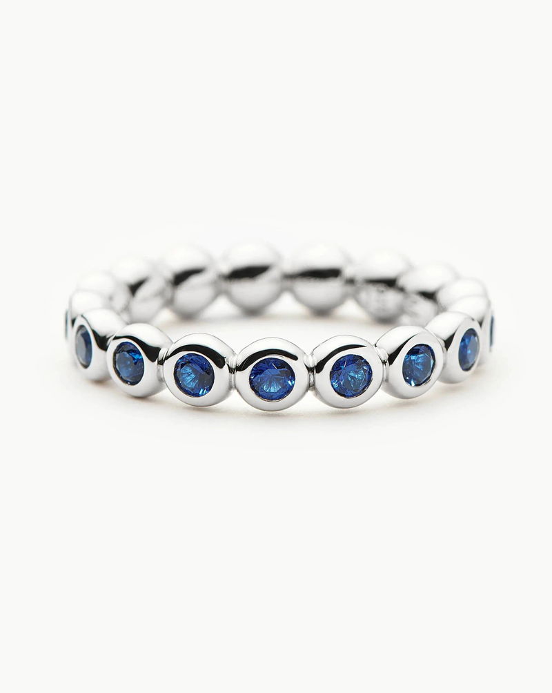 This classic eternity ring features faceted nano-crystals set in silver collet cups. Perfect for September birthdays, wear solo or team with more rings for an instant stack.