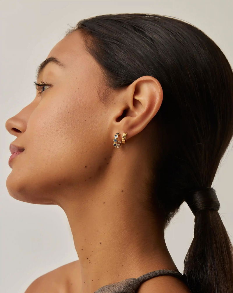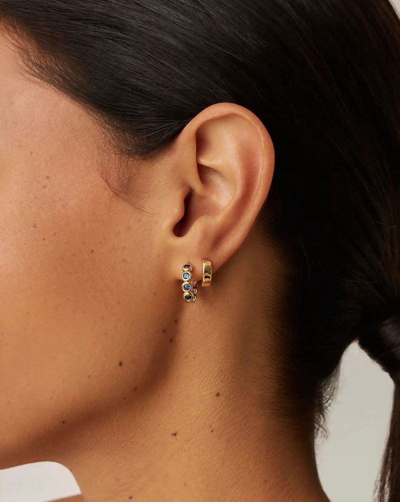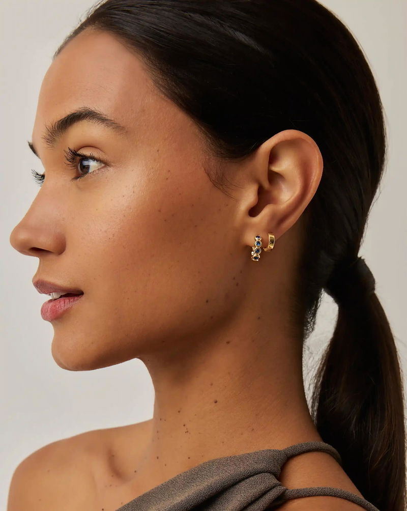 Your favourite Tennis Small Hoops now reimagined in a new sapphire blue colourway. These classic earrings feature faceted nano-crystals set in gold collet cups. Perfect for September birthdays, wear solo or team with studs or a hoops for an instant ear stack.