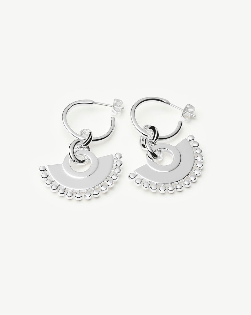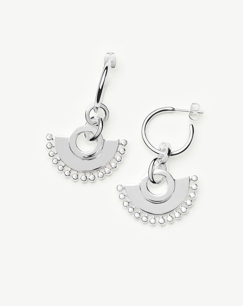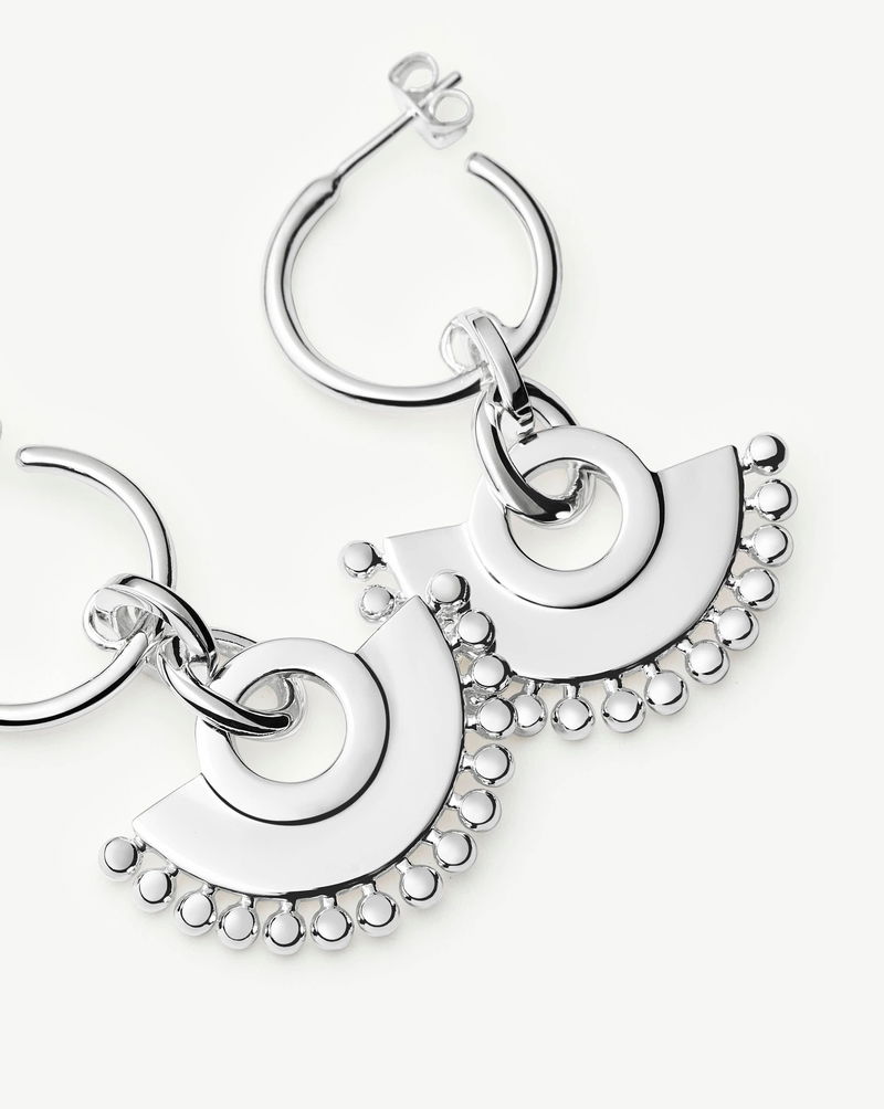 The best selling Zenyu Fan Chandelier Earrings now available in silver. These everyday statement hoops are inspired by Colombia and feature bobble-trimmed charms suspended from delicate hoops. Add to your ear stack with chunky silver huggies or studs.