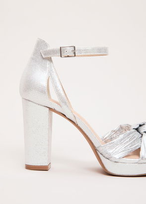 The Angela Raschel platform sandals are characterized by their intricate lamé pattern. They're complete with leather lining and a gold-toned buckle for fastening.