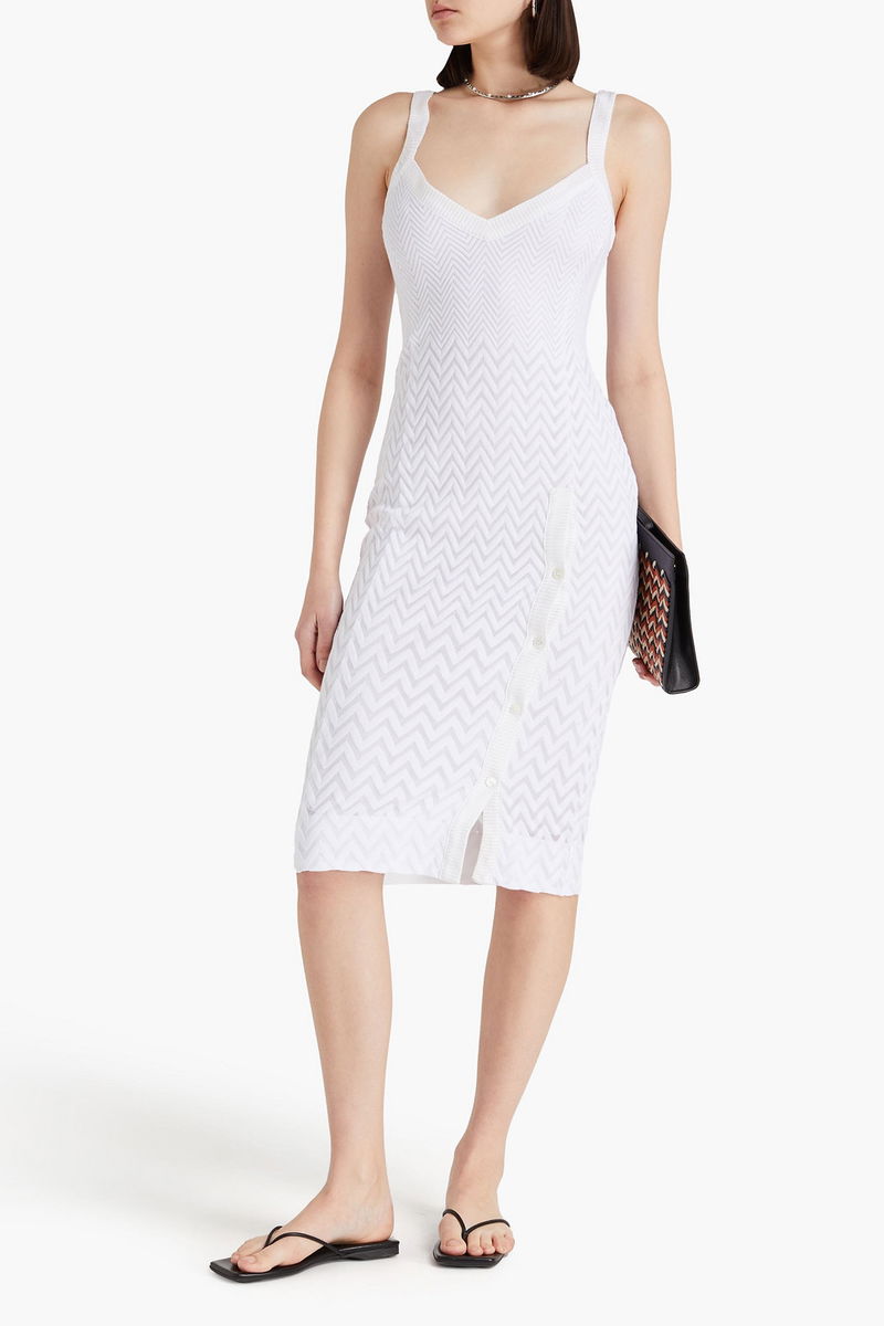 Dress, Crochet-knit, Cotton-blend, Ribbed trims, Button-detailed, Slips on, Fully lined, Mid-weight knit.