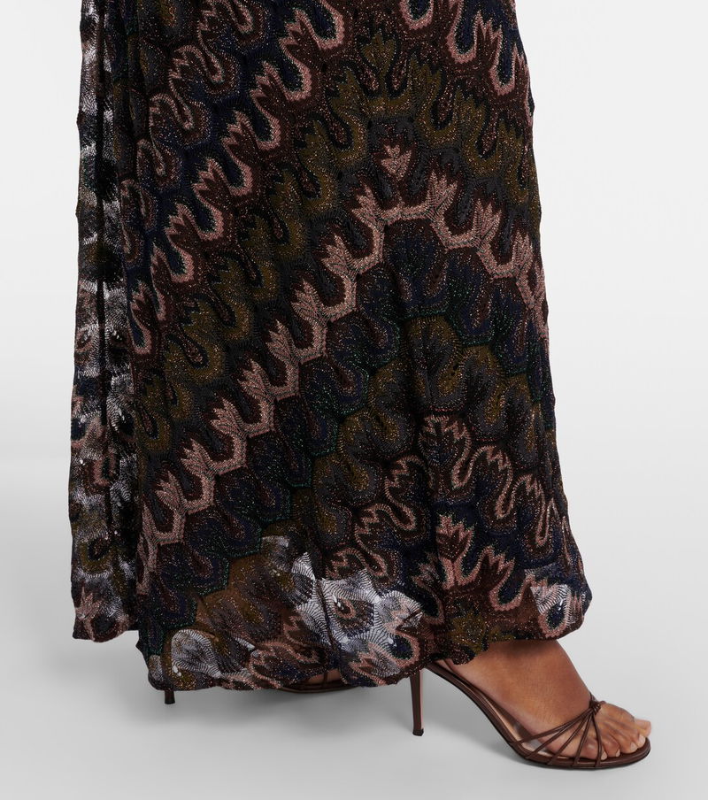 Defined by luminous transparencies and dazzling details, this maxi dress by Missoni is ribbed-knitted from lamé. The style is defined by a chevron pattern, a house signature.