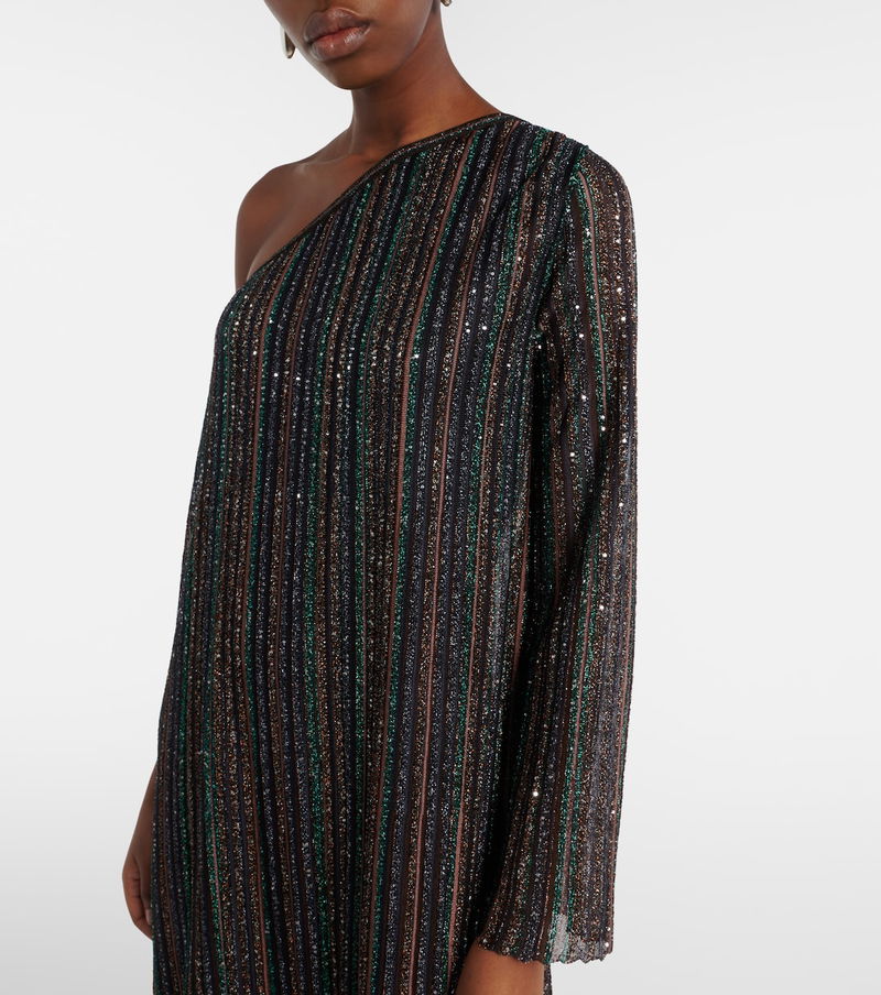 Defined by luminous transparencies and dazzling details, this minidress by Missoni is ribbed-knitted from lamé. The style is defined by a tonal chevron motif that defines the brand's signature.