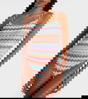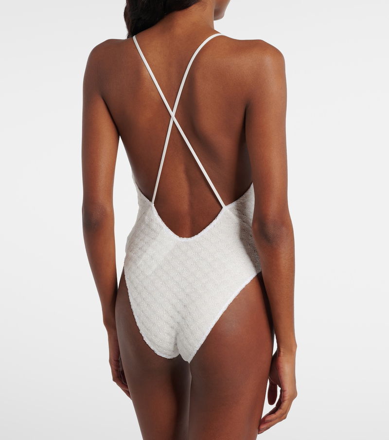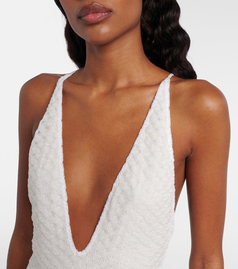 This swimsuit from Missoni is presented in the signature lustrous lamé knit. The design features a deep-cut V-neckline and criss-cross back straps for a flattering fit.