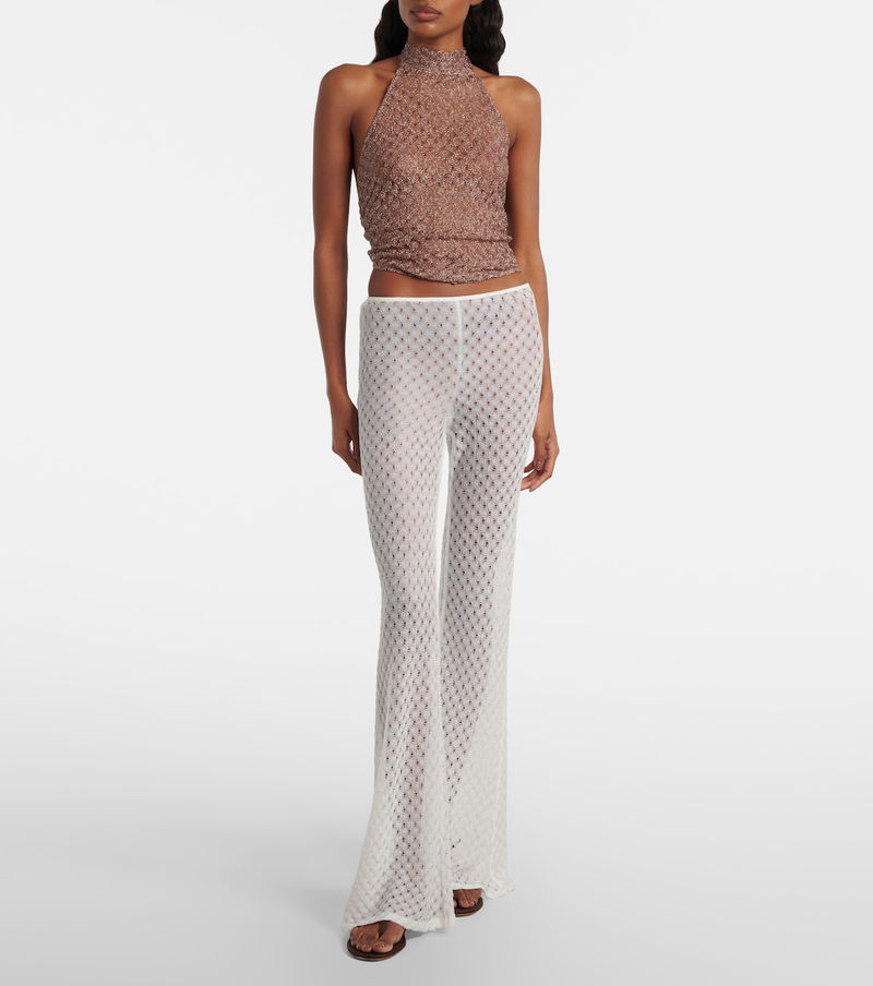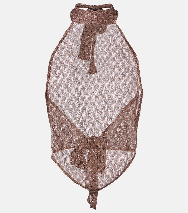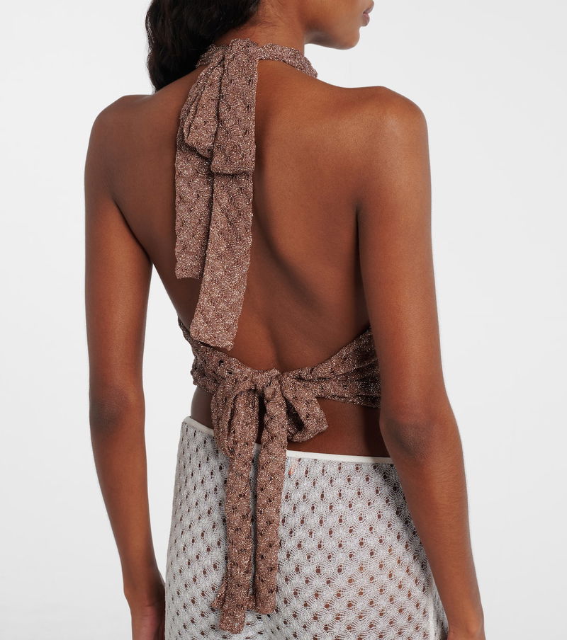 This top from Missoni showcases a shiny lamé construction, presented in an open-knit pattern. The design features a self-tie halterneck silhouette and V-cut hem for a flattering fit.