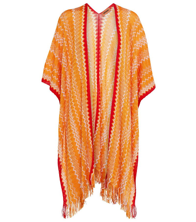 Missoni's iconic Zig Zag pattern was first introduced in the 1950s and is now a symbol of Italian luxury. This cape is rendered in a vibrant orange-and-red hue and boasts the house's signature all-over pattern.