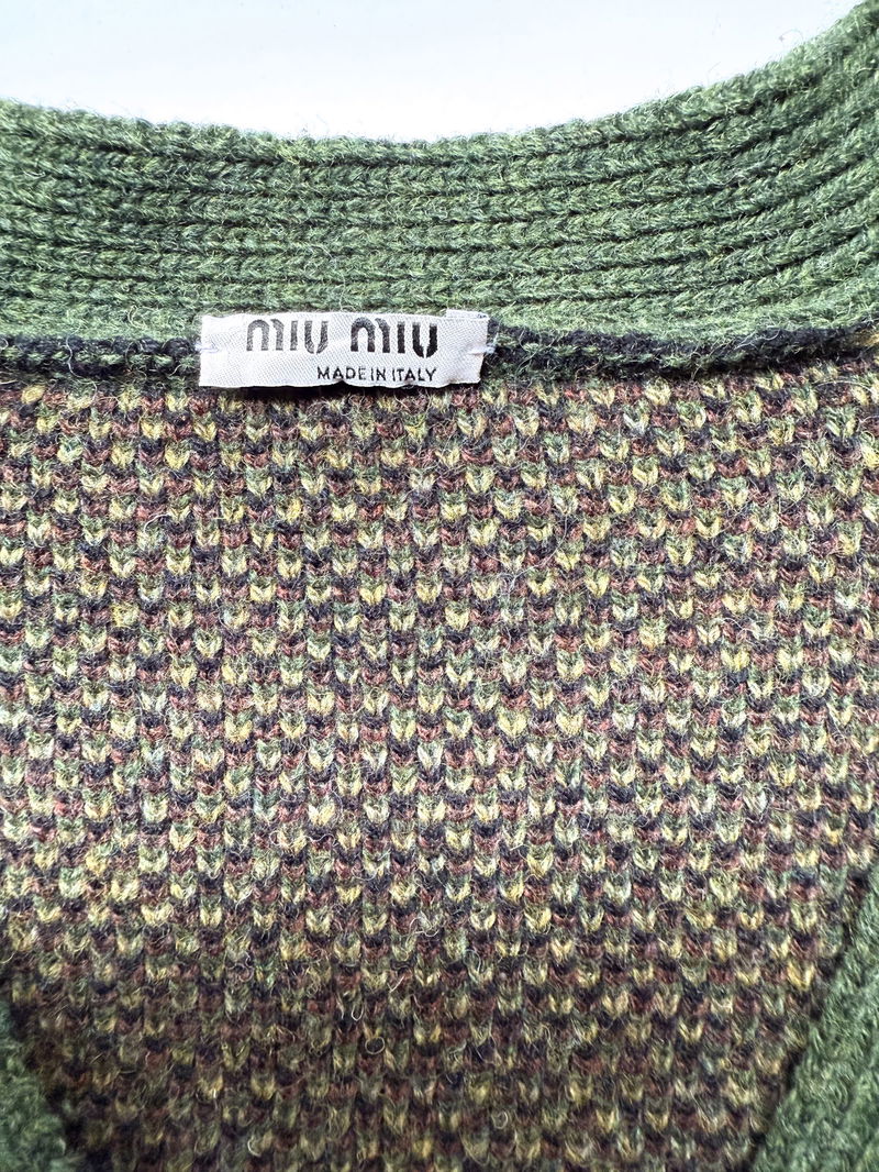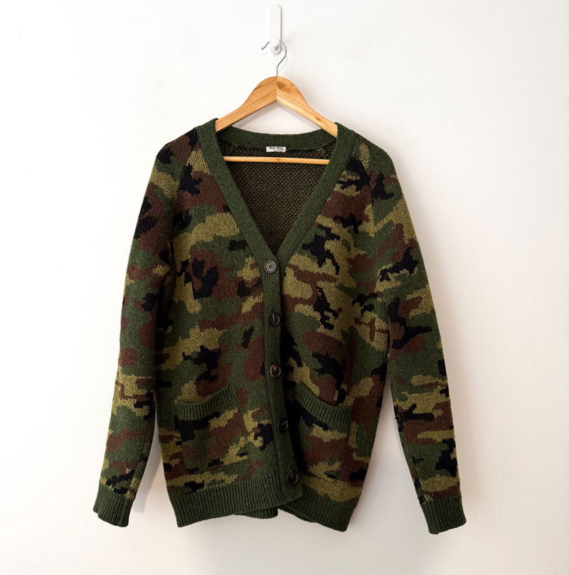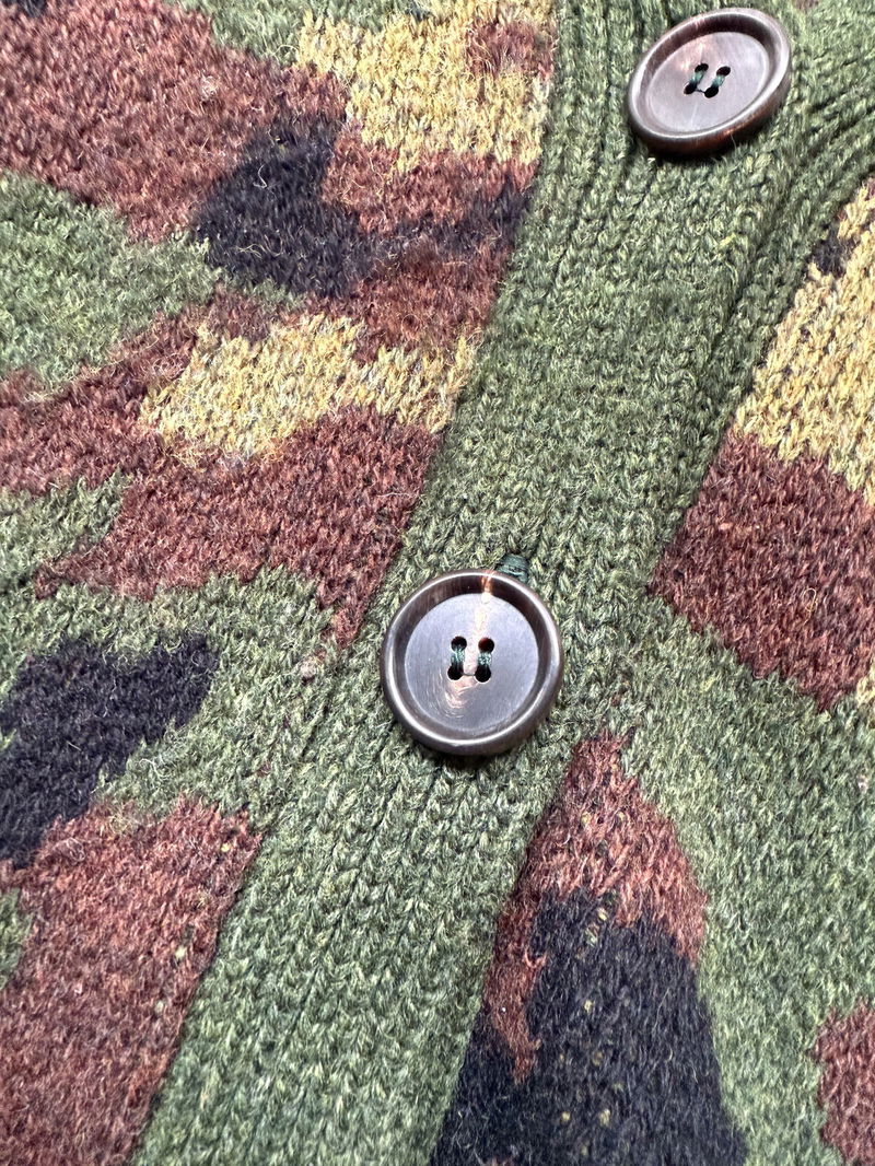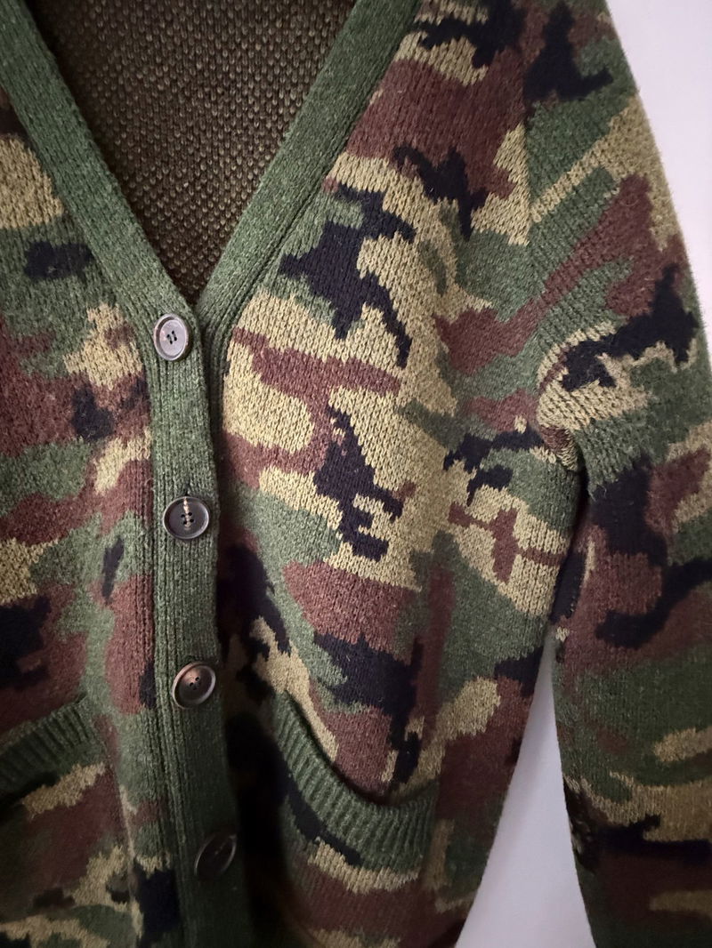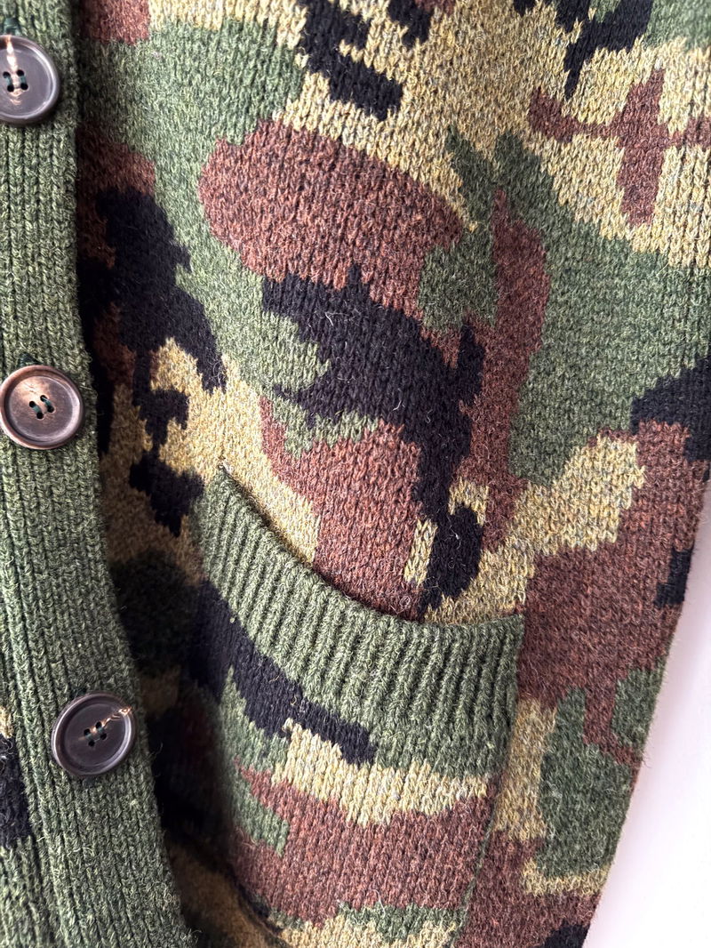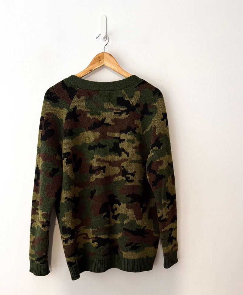 Crafted of rich Italian virgin wool, this cozy V-neck cardigan is woven through with a bold camo design and cut with an oversized boyfriend fit.