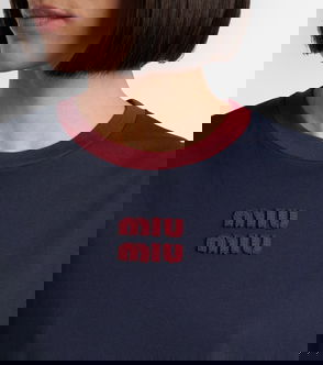 This white top is an off-duty essential for the Miu Miu girl. Made in Italy from casual cotton jersey, it has an oversized collar with navy blue embroidery and scalloped lace edges. It's designed for a cropped, boxy fit.