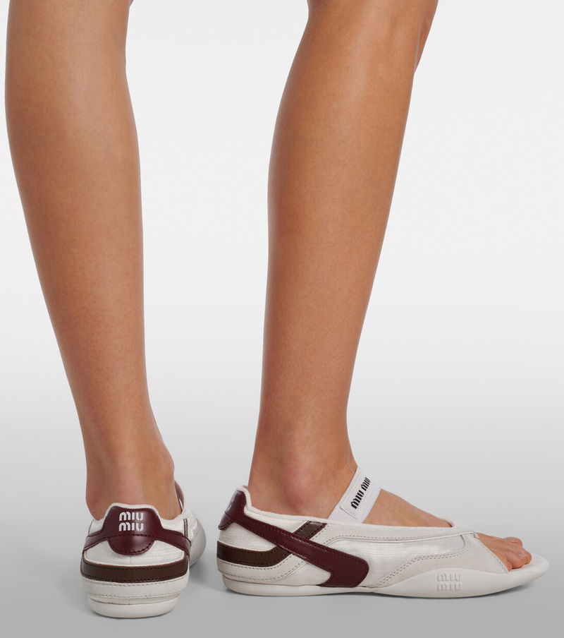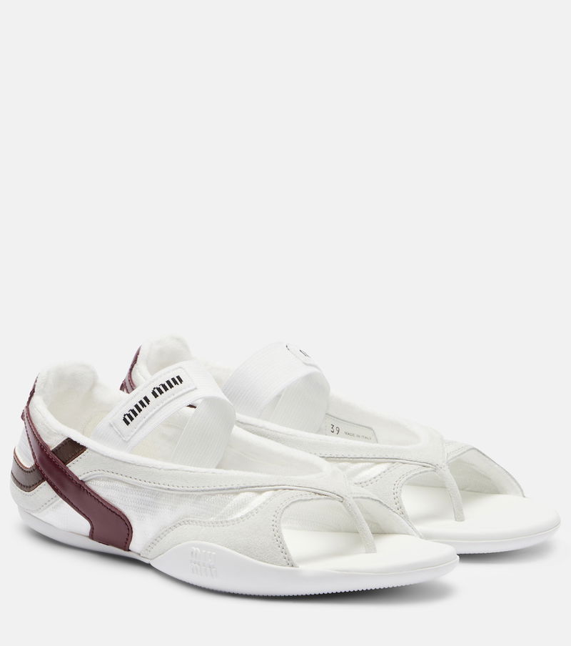 Uninhibited and deliberately subversive: these are the hallmarks of Miuccia Prada’s Miu Miu. Crafted from smooth suede, leather, and breathable mesh, the hybrid Gymnasium thong sandals feature a sneaker-inspired silhouette and signature logo detailing.