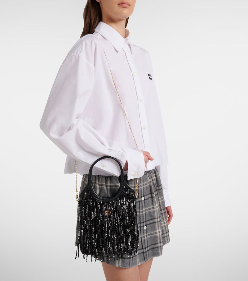 This Ivy top-handle bag from Miu Miu is defined by a lustrous satin construction and tonal leather top handles. The design is decorated throughout with dazzling sequins and beaded fringe details, coupled with a gold-toned chain strap for easy carry.