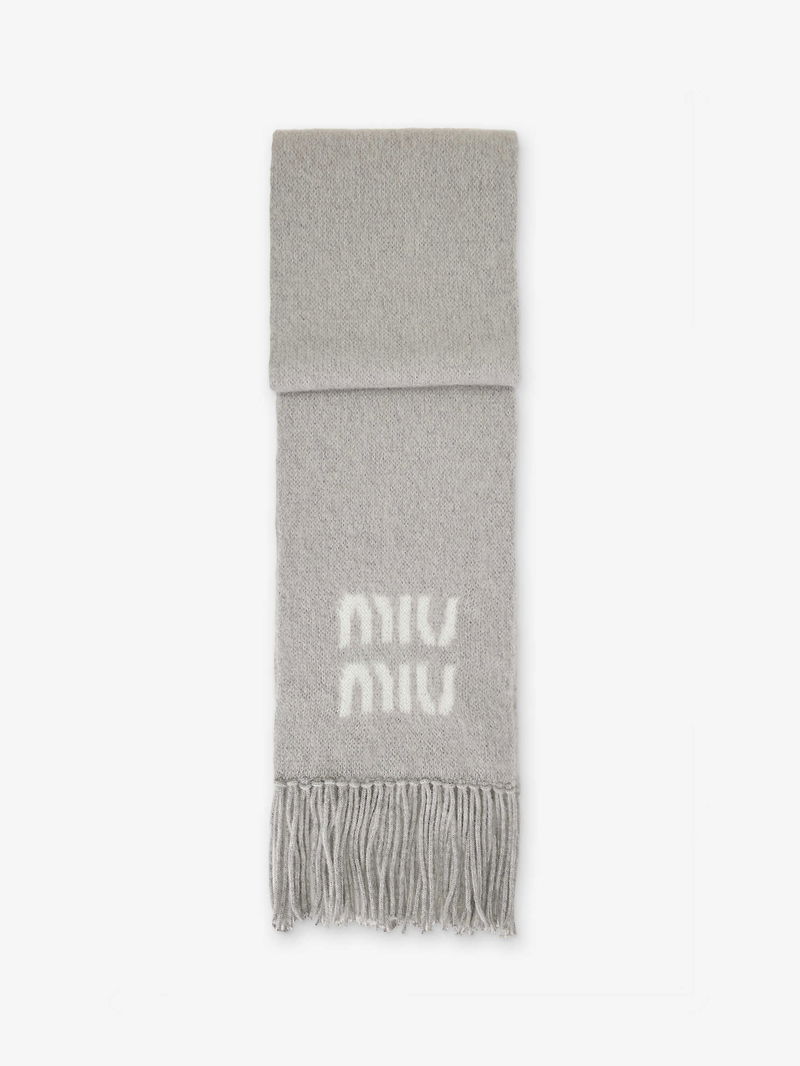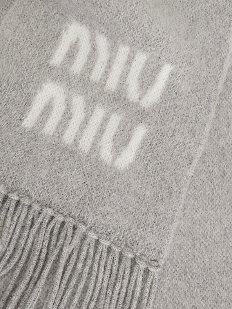 Miu Miu mohair-blend scarf. Self-tie fastening. Rectangular silhouette, brand jacquard at front, fringe trims.