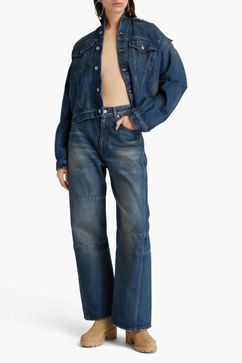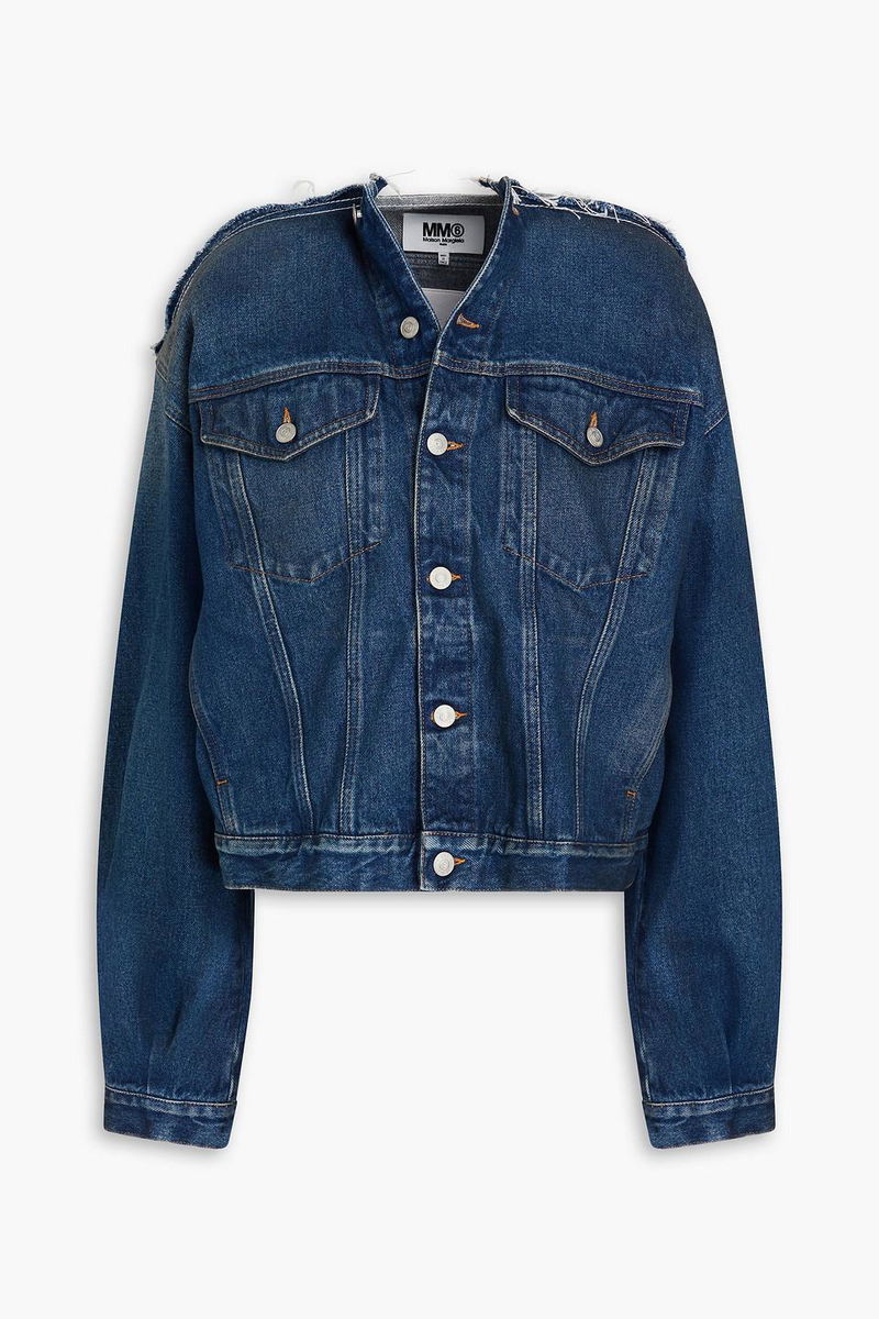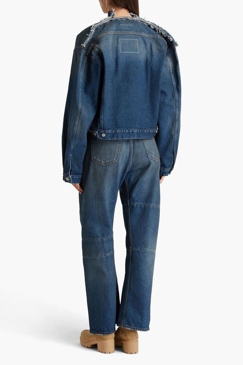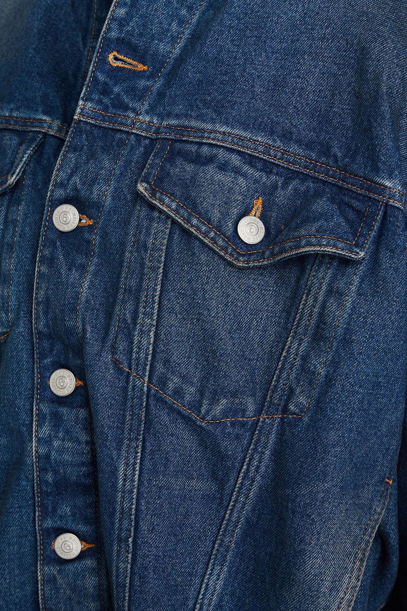Jacket, Faded, Denim, Frayed trims, Buttoned waist tabs, Buttoned cuffs, Breast pockets, Two side slit pockets, Button fastenings through front, Mid-weight, non-stretchy fabric.