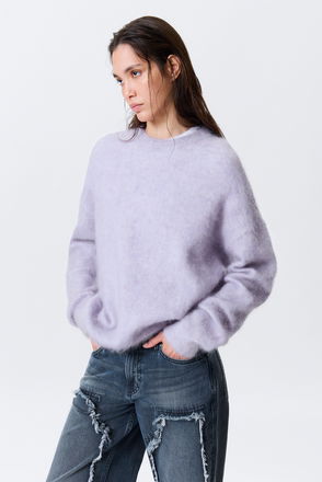 Sweater. Knitted. Oversized. Contrasting trims. Ribbed trims. Scalloped trims. Split cuffs. Slips on. Lightweight knit.