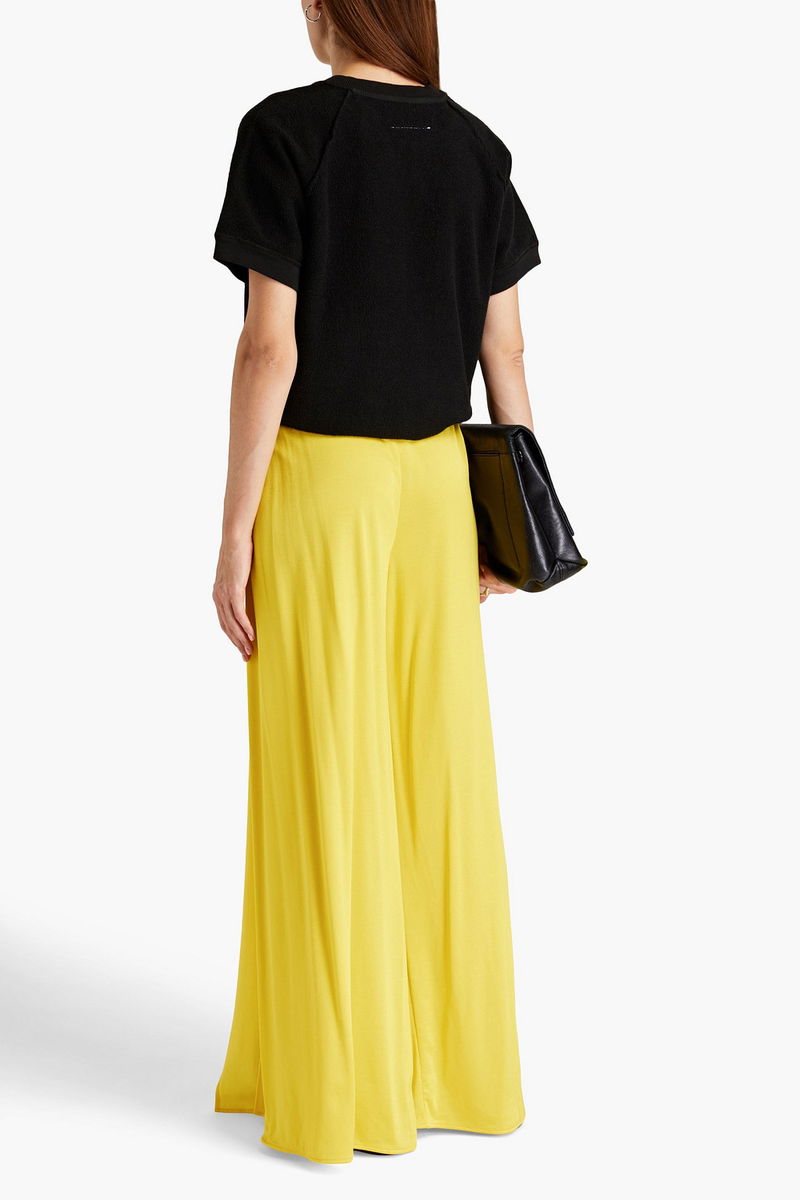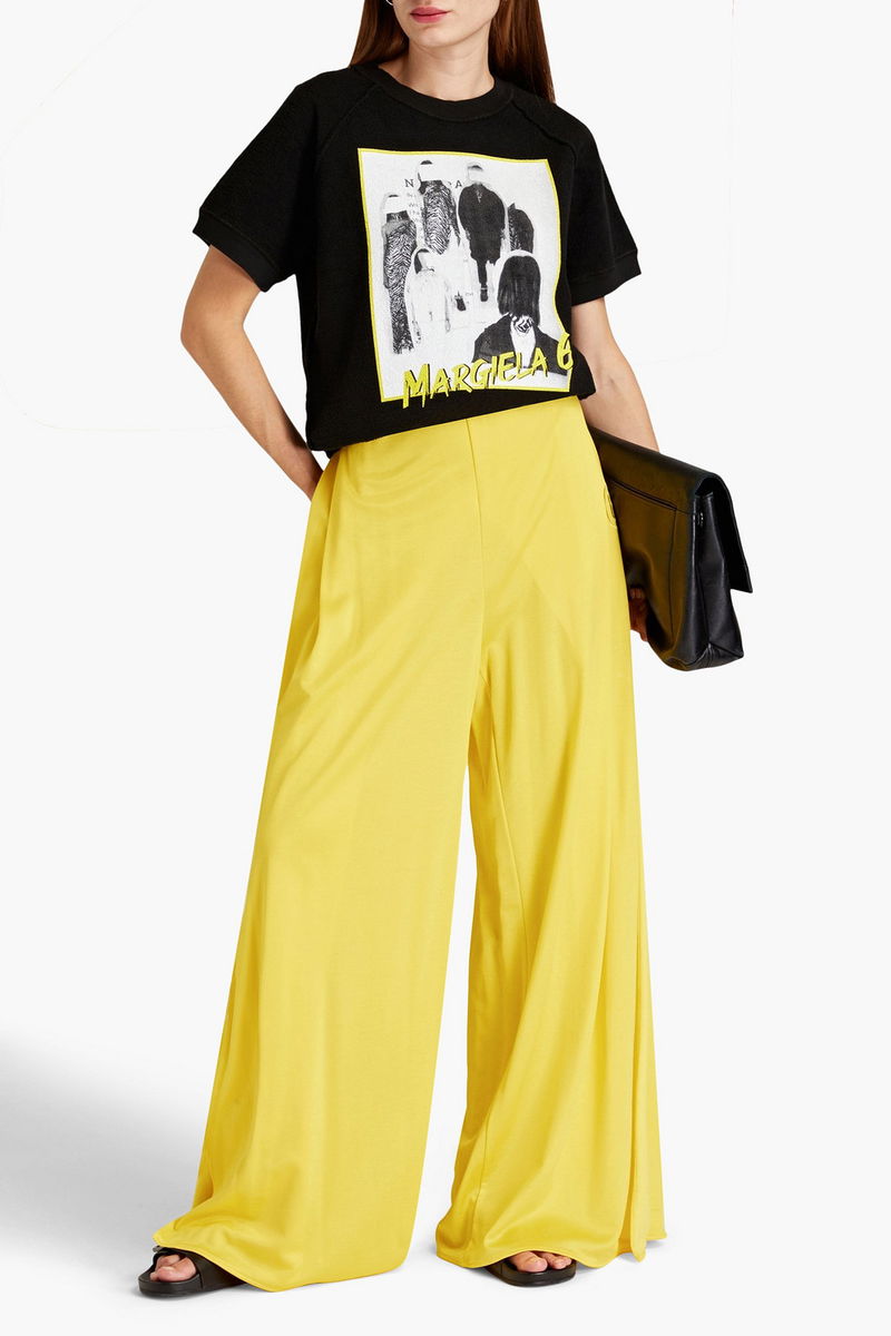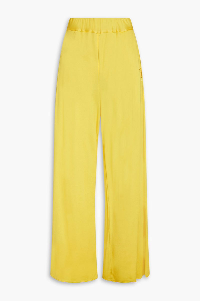 Wide-leg pants, Satin-jersey, Pleated, Embroidered logo, Elasticated waist, High-rise cut, Side splits, Pull on, Slightly stretchy fabric, Mid-weight fabric.