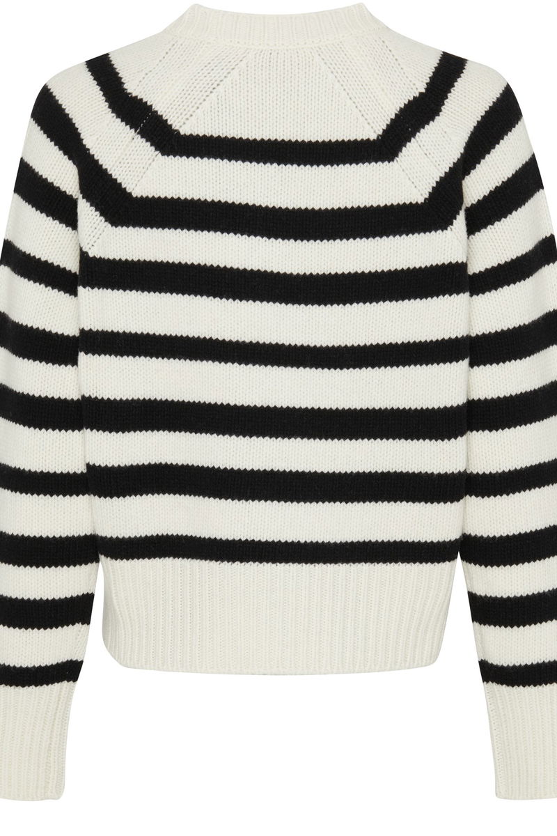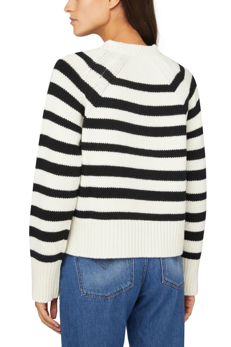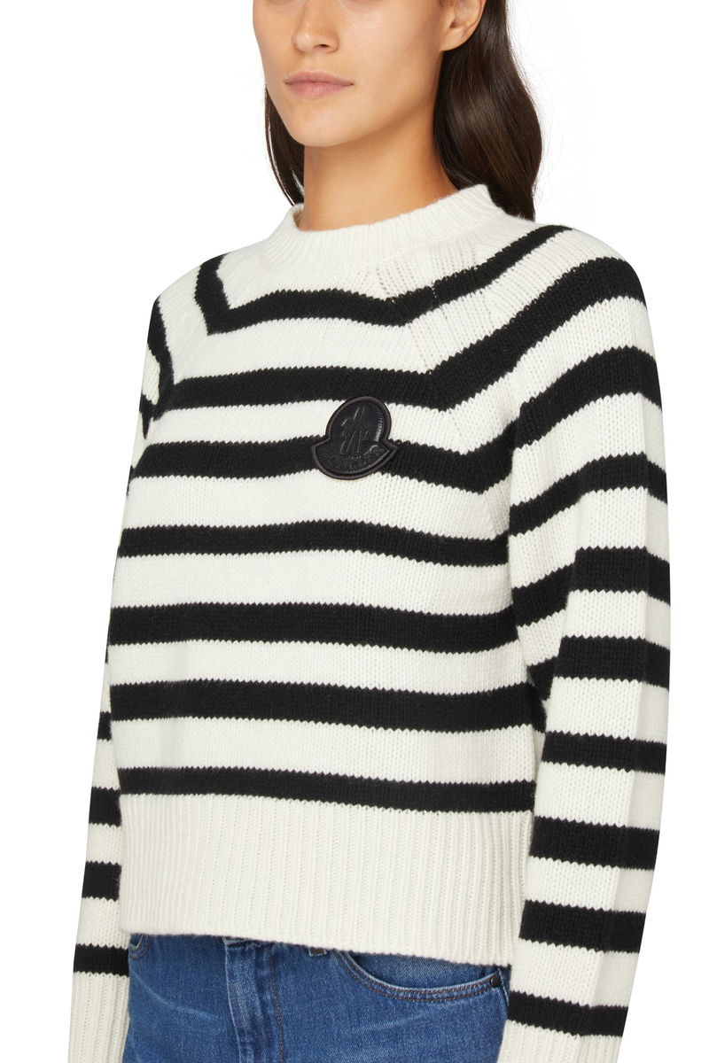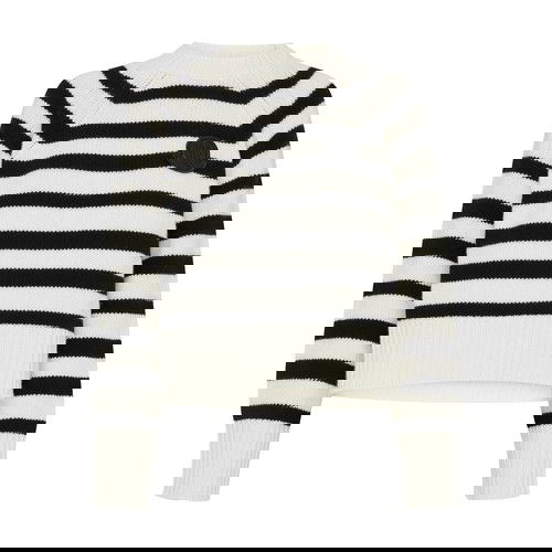 Knit sweater. Long sleeves. Round neck. Ribbed. Two-tone striped pattern. Chest logo.