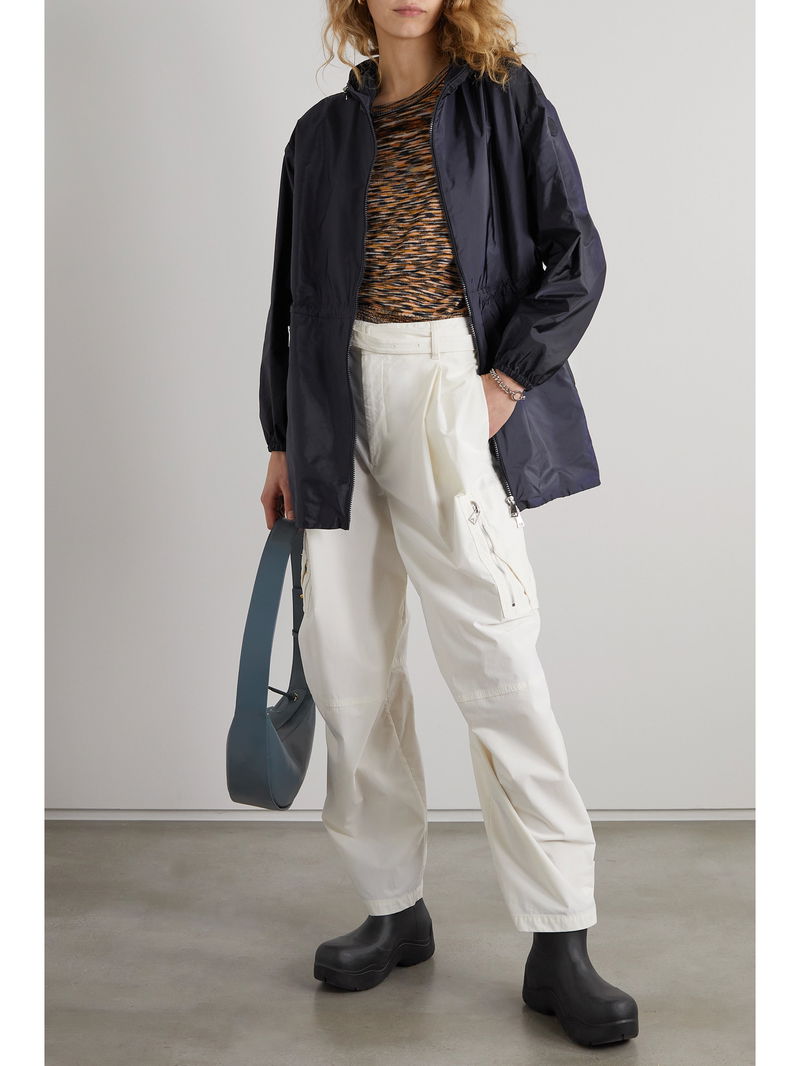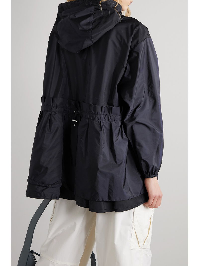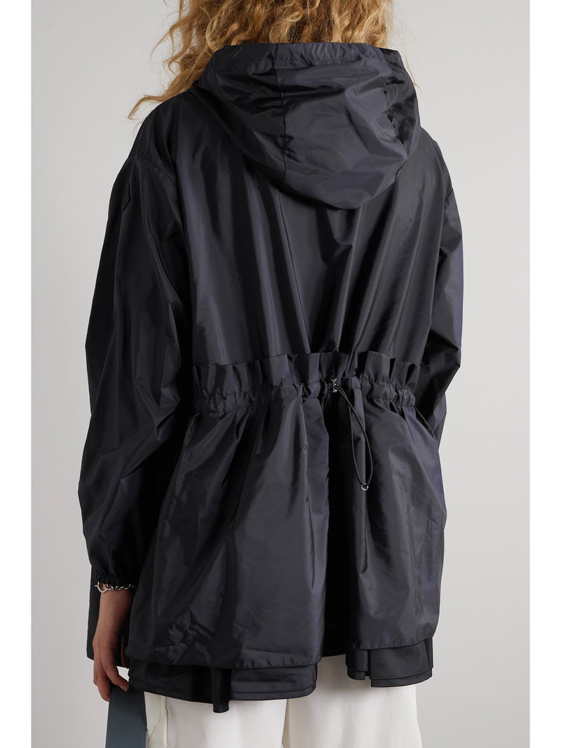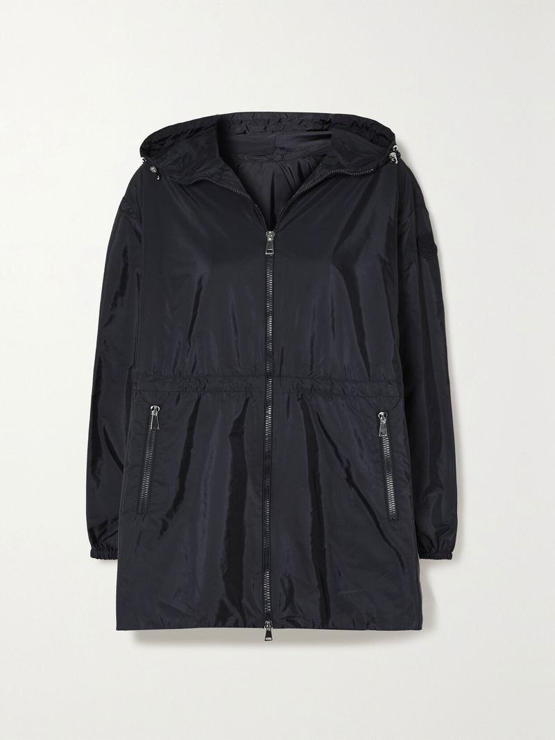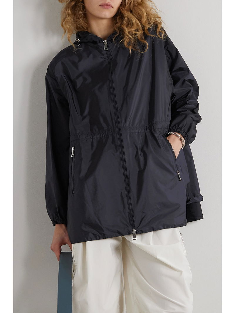 Moncler's jacket is great for rainy days and après ski. Made from durable black shell, it has a protective hood and drawcords at the waist to define the loose silhouette.
