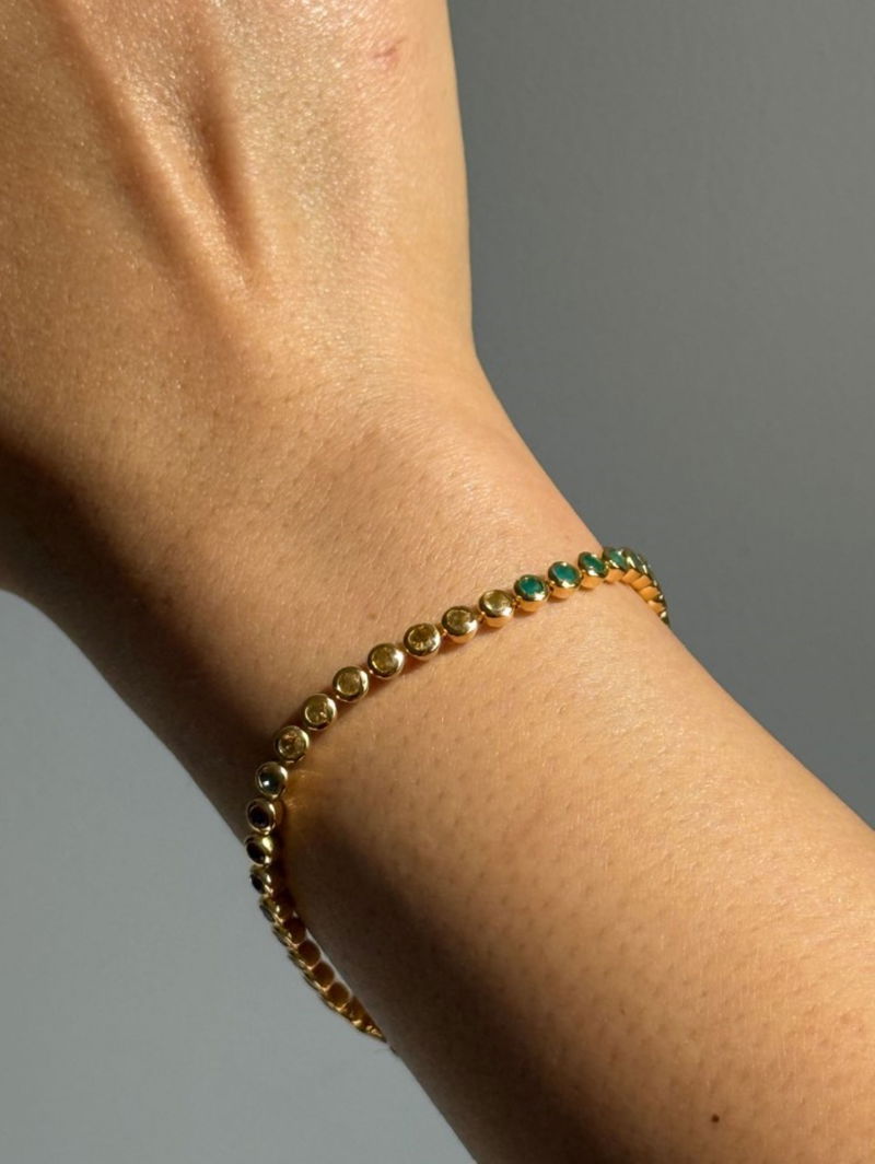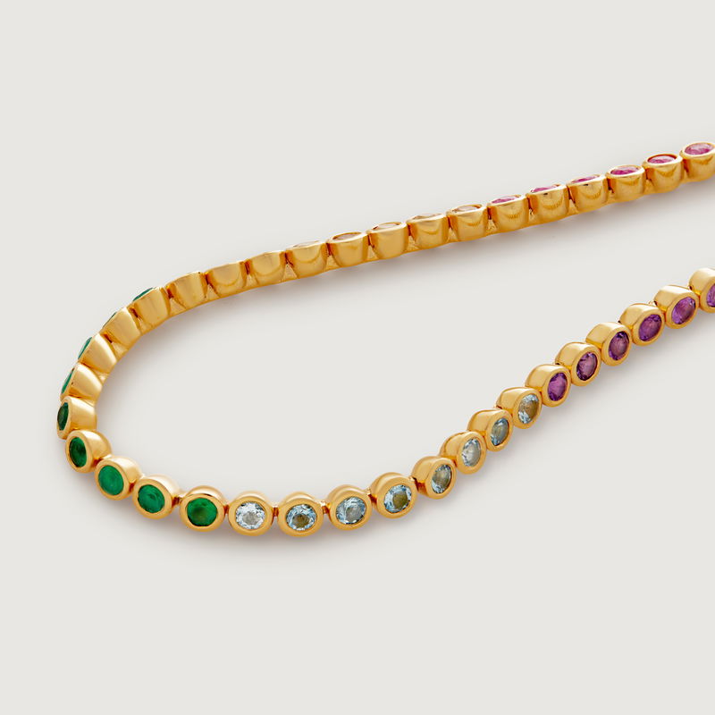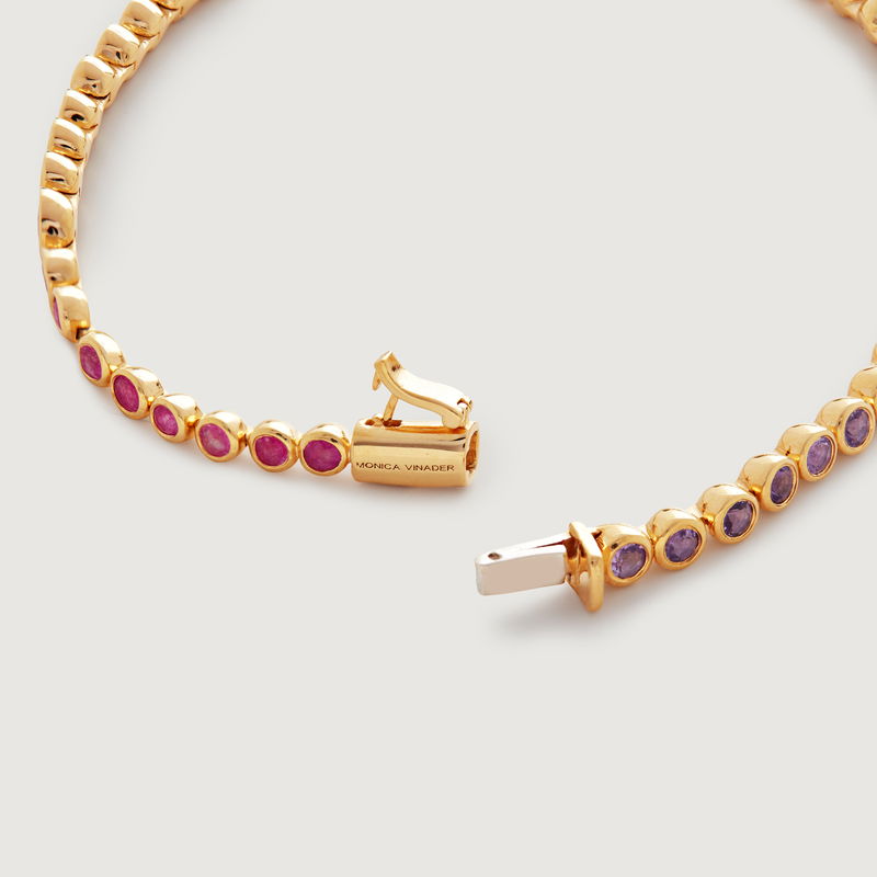 The tennis bracelet gets a modern makeover. Crafted in 18k gold vermeil, this high-impact piece is set with gemstones for a continuous stream of shine.