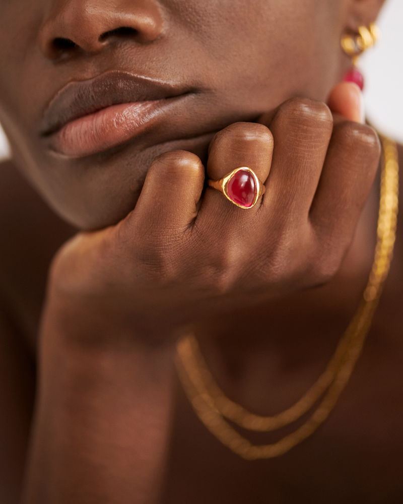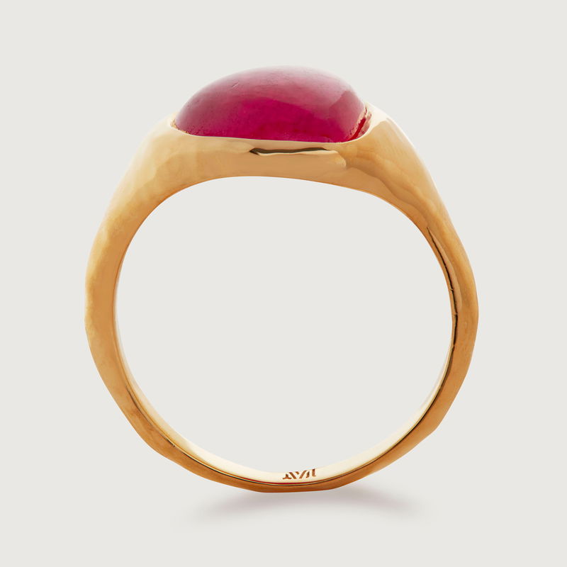 A rich pink quartz gemstone, hand-set in 100% recycled 18k gold vermeil in this bold, elegant ring. Wear alone or stack with other rings for a colourful statement.