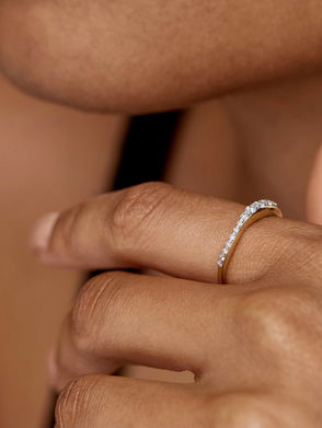 Rethink the shape and the design of diamond rings with this Monica Vinader ring. The irregular hoop shape features pave set diamonds. It rests on a lightly textured band giving it an organic feel. This ring is a contemporary way to wear diamonds and shines beautifully alone or styled with skinny rings.