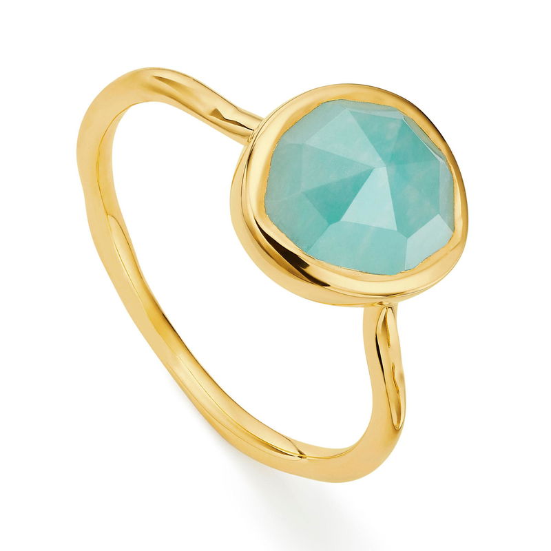 Perfect for stacking, this delicate ring features an organic, irregular shaped multifaceted amazonite gemstone, set in 18ct Gold Plated Vermeil on Sterling Silver. The band has a slightly waved edge and the stone on this ring measures approximately 8mm x 7mm (0.3 x 0.28'). Wear with other Siren stacking rings for a unique look.