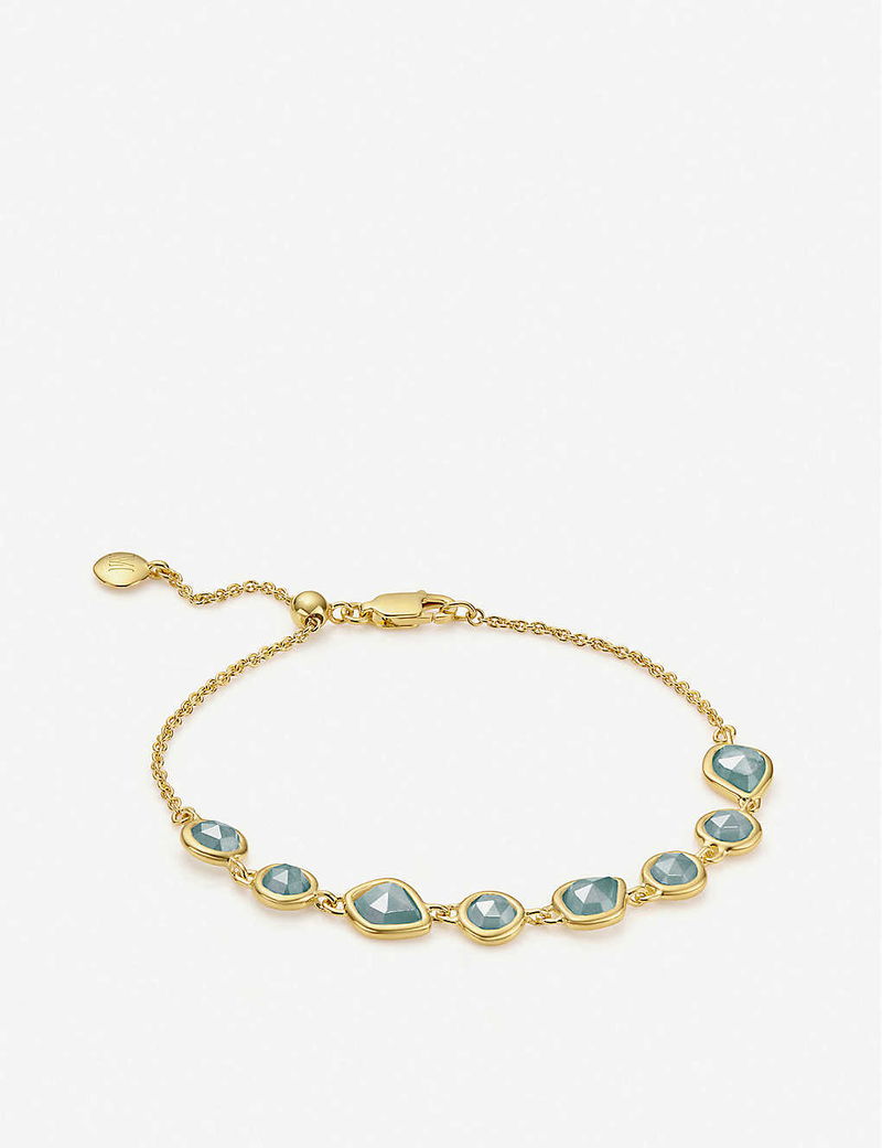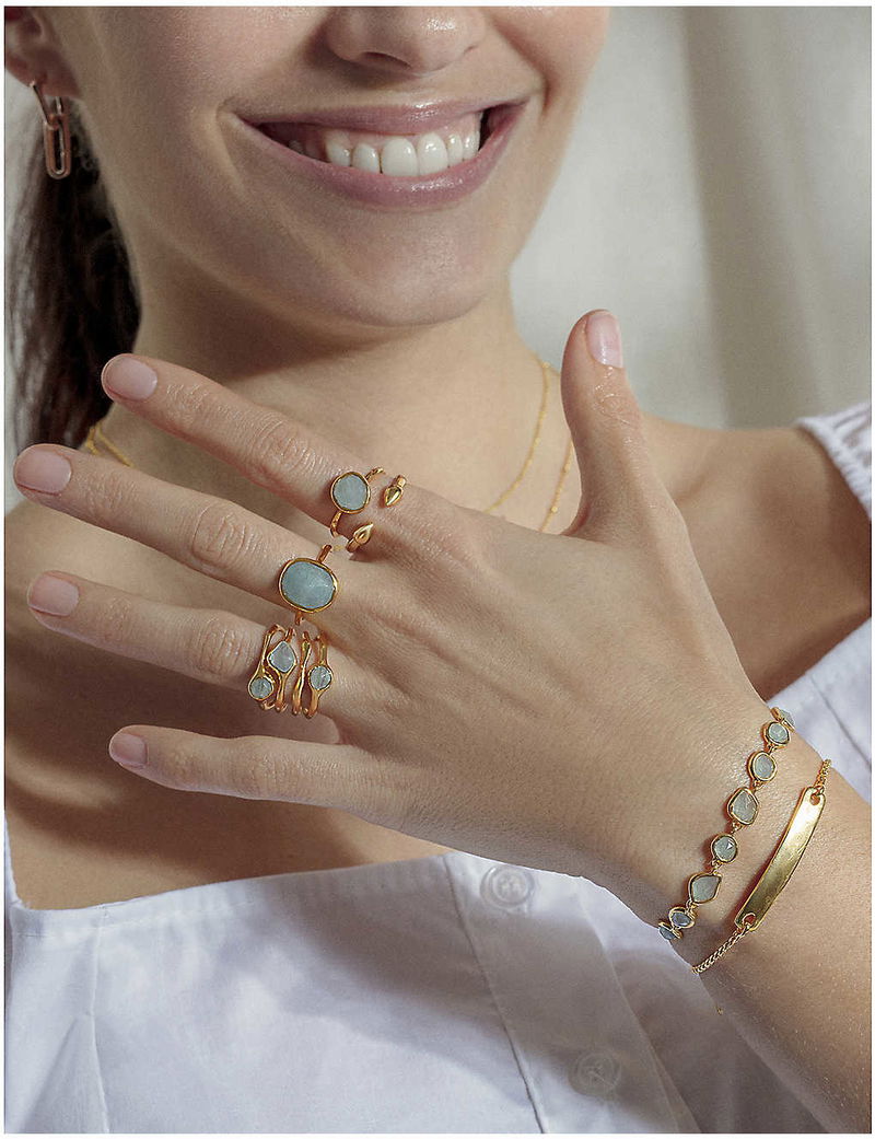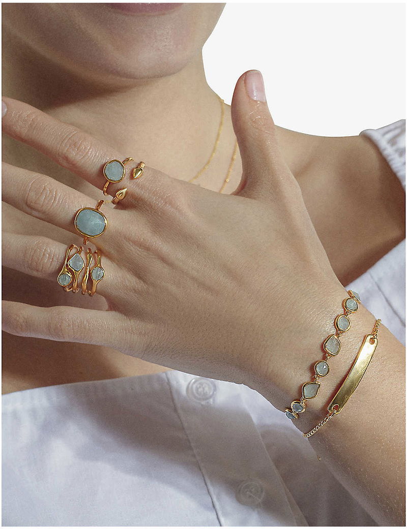 Monica Vinader’s Siren collection is inspired by the beach stones of southern Italy, and how the movement of the sea sculpts and washes them ashore in colourful arrays that quietly sparkle from Capri to Lecce. The Mini Nugget Cluster bracelet has a line of eight dreamy, cloudy, translucent aquamarine gemstones strung together with 18ct gold vermeil.