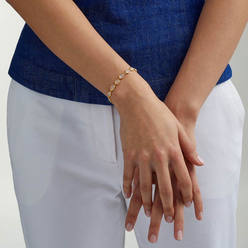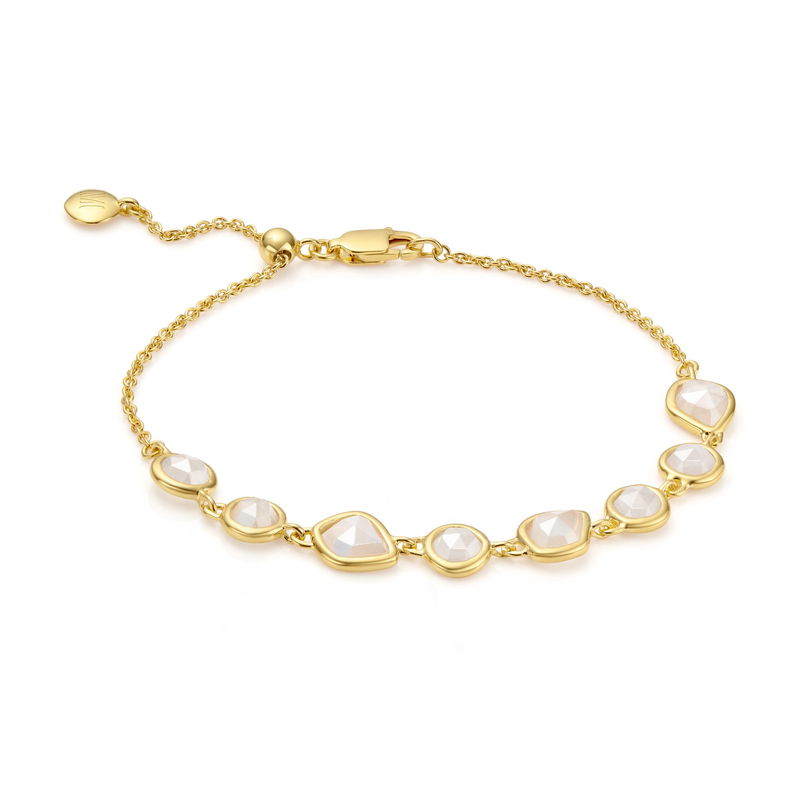 This beautiful Siren Mini Nugget Cluster bracelet features eight organic shaped, rose cut Moonstone gemstones, in 18ct Gold Vermeil on Sterling Silver and measures 75mm in width and 180mm in length. The chain has an adjustable sliding bead that allows you to adjust its length.