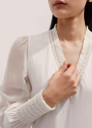 Very cottagecore. Designed in a light cotton fabric with decorative stripes subtly running through, this billowy blouse is detailed with ric-rac flowers and frilly finishes. The perfect piece to style throughout the warmer seasons.