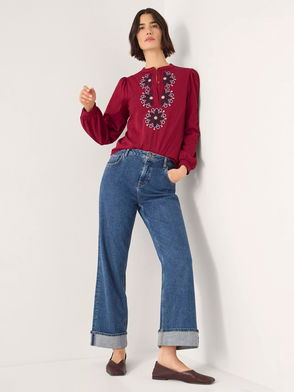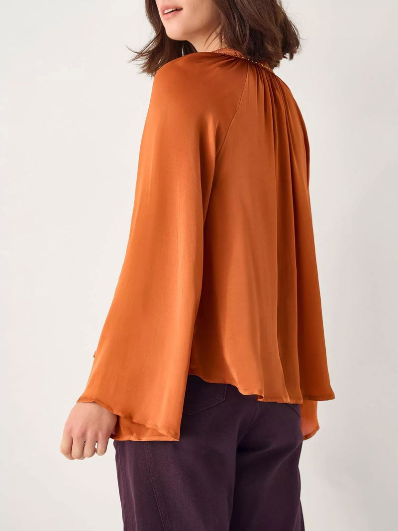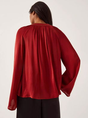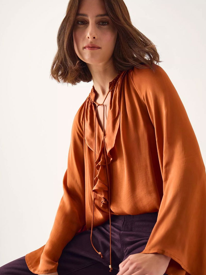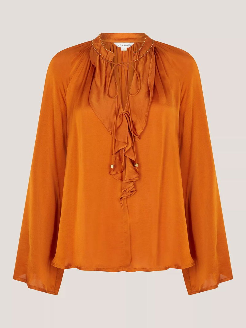 A textured frilly blouse from Monsoon, made from light viscose. With a V-neck and long sleeves, it comes in an easily styled plain colouring. One you'll reach for again and again.
