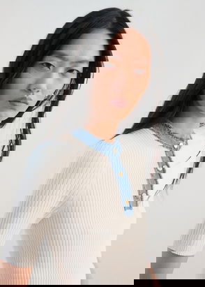 A slouchy-chic knitted jumper, designed with a collar neckline and blouson sleeves. Elevated with a faux pearl trim and bow.