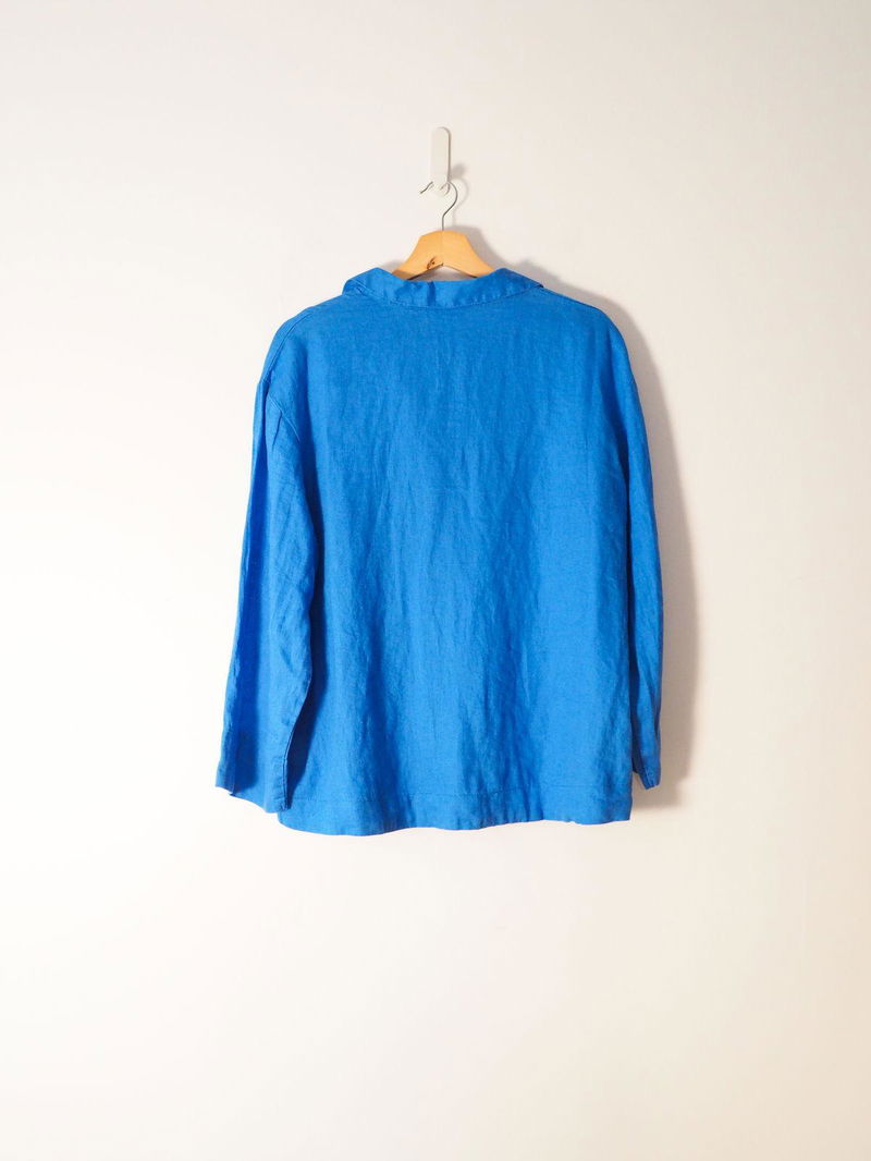 Smart summer-proofs. Whisked from breezy, lightweight linen, this blouse features a sharp collar, open front and full length sleeves. Finished with a single pearly button for a touch of opulence to this chic, simple style.