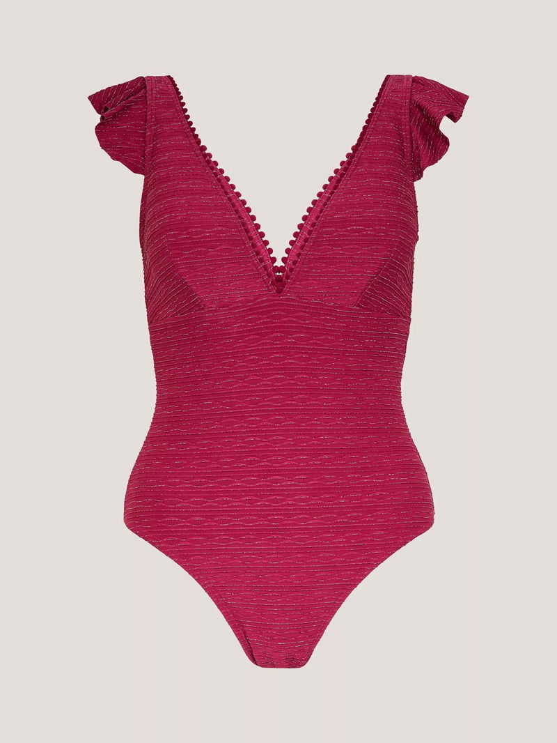 Kaylie Plunge Rib Ruffle Swimsuit, Burgundy