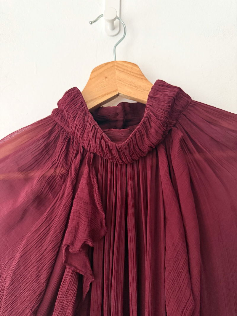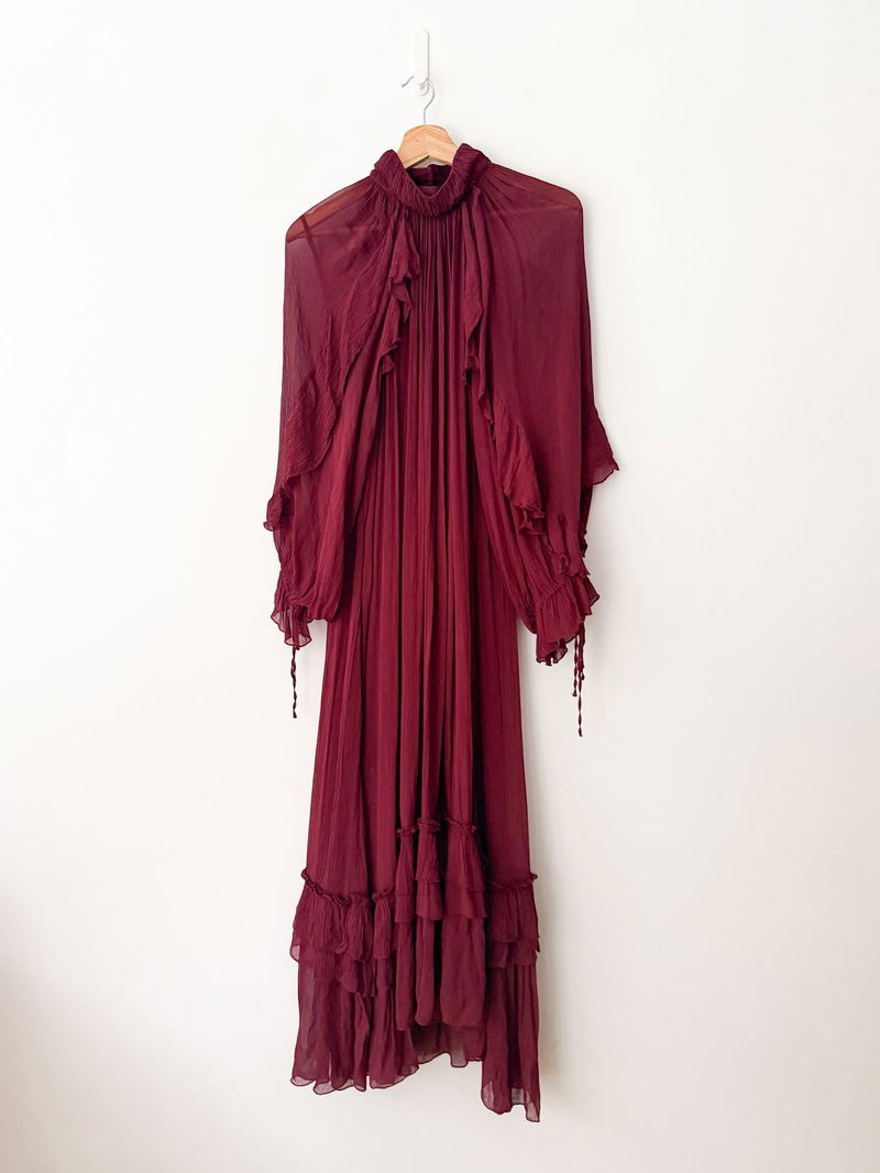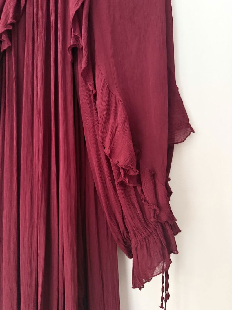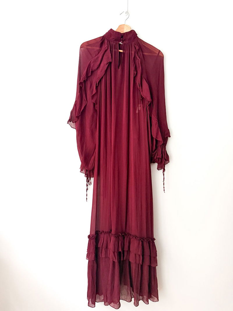 Berry sweet. A frilly frock for the modern bohemian, it's a dress you can style for any occasion. Boasting a gauzy, lightweight fabric with a crinkled finish, it's designed with a high neckline and elegant ruffles cascading down the sleeves and midi-length hem.