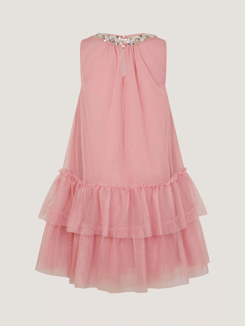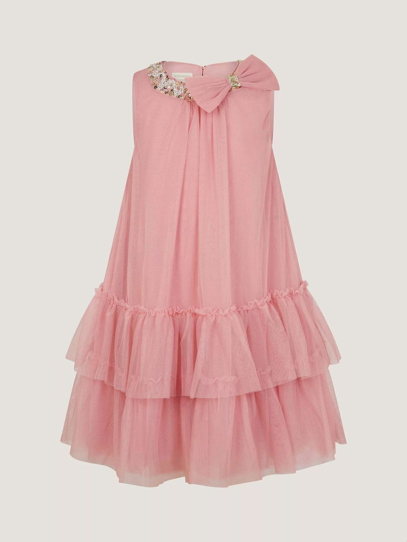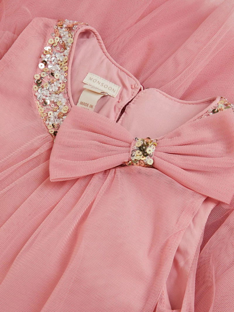 This pretty pink ruffle dress has bow and sequin embellishments. Perfect for parties and other special occasions.