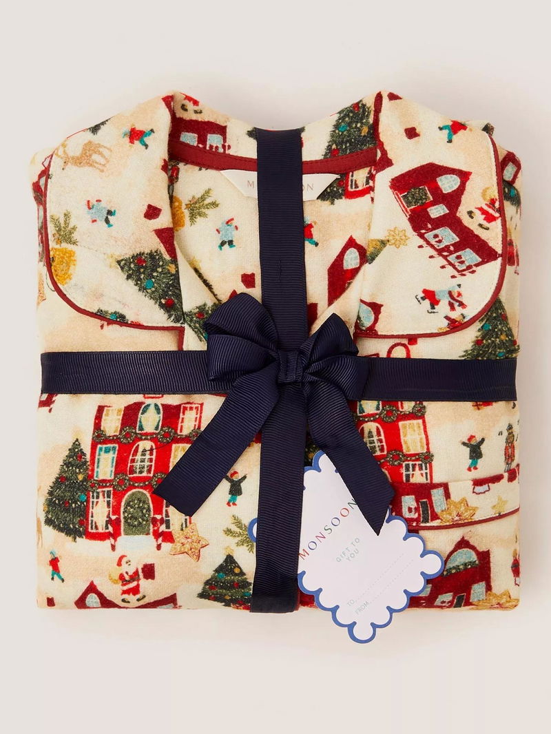 Kids' Cotton Long Sleeved Christmas Pyjamas, Cream/Multi