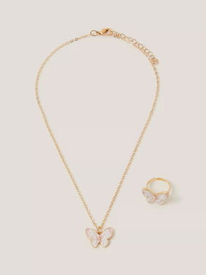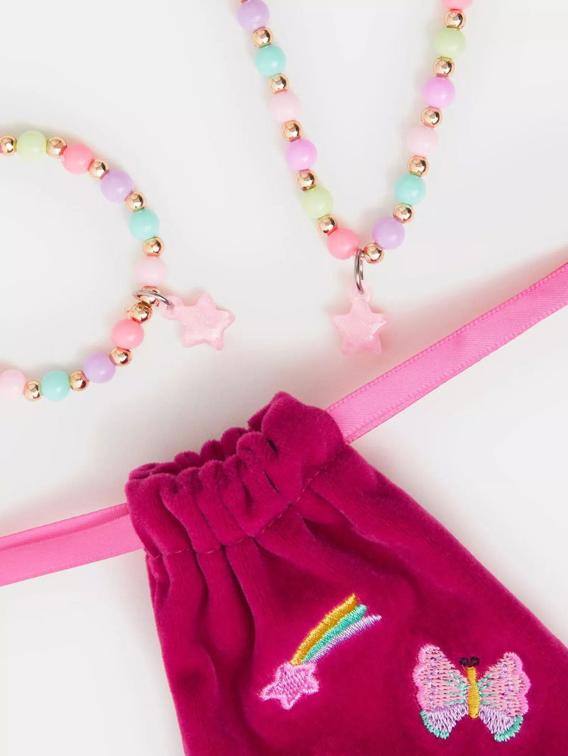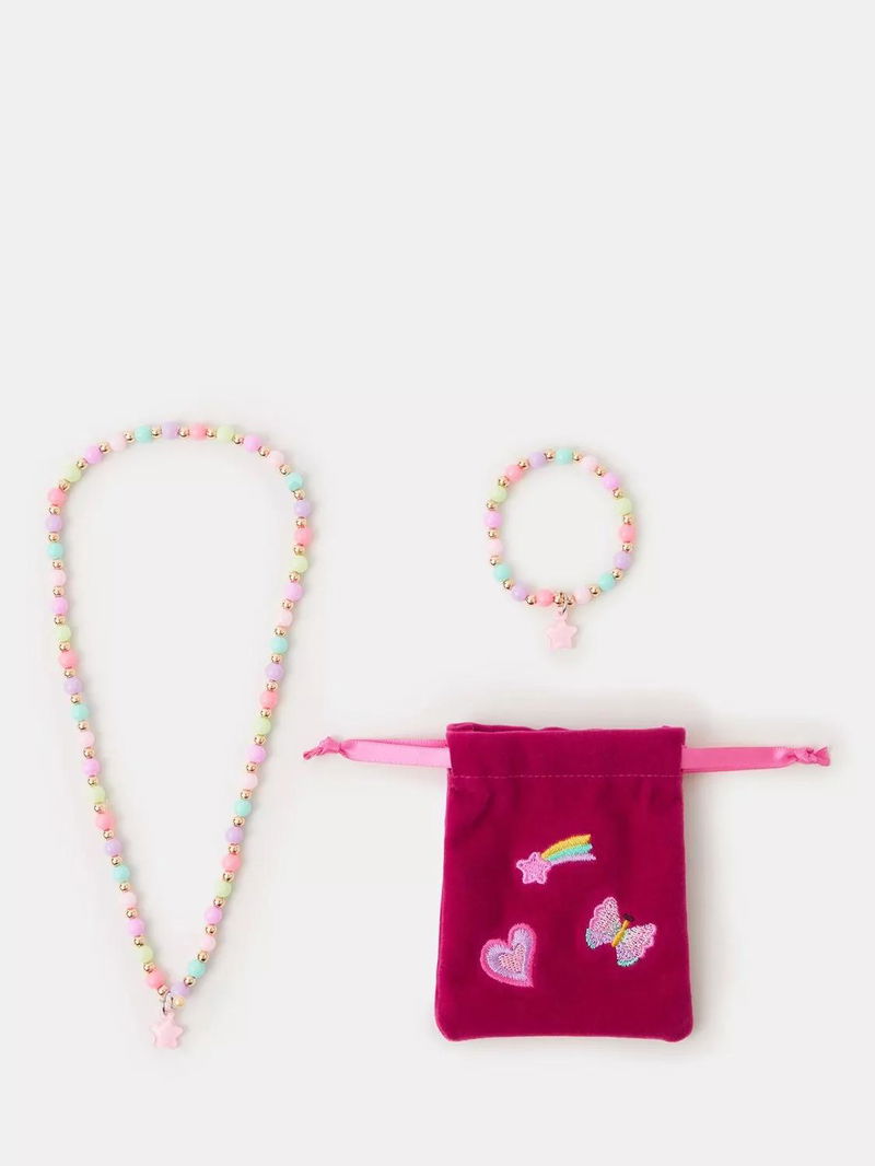 Strung with round beads in gold and pastel colours, this jewellery duo includes a necklace and bracelet, both finished with a pink star charm.